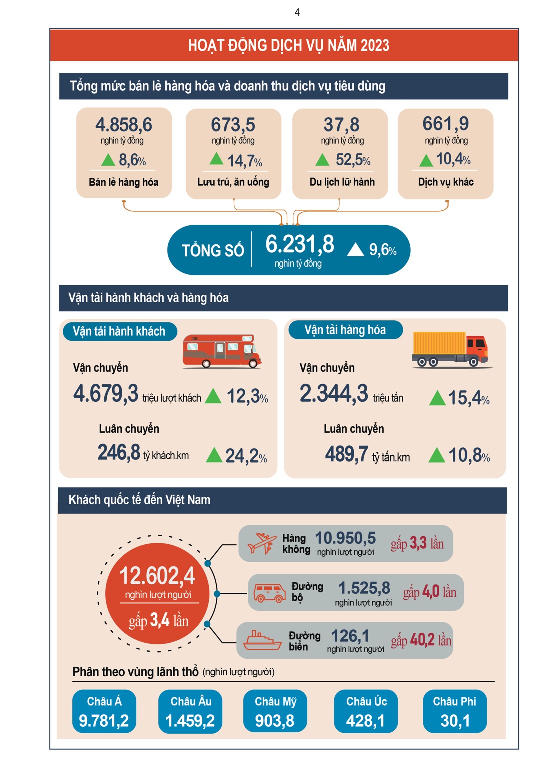 Khách quốc tế đến Việt Nam đạt 12,6 triệu lượt người, gấp 3,4 lần năm 2022, số lượt người Việt Nam xuất cảnh đạt 5 triệu lượt người, gấn 2 lần năm trước.