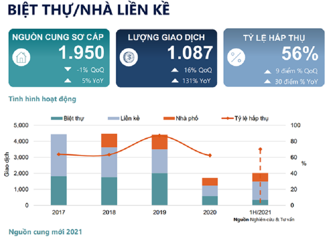 Tỷ lệ hấp thụ trong quý vừa qua ghi nhận mức cao nhất kể từ Q2/2019, với nhà LK và nhà phố thương mại chiếm 83% lượng giao dịch. 63% lượng mở bán mới đã được hấp thụ. Giá sơ cấp trung bình của biệt thự đạt 4.907 USD/m2, tăng 10% theo quý và 3% theo năm.