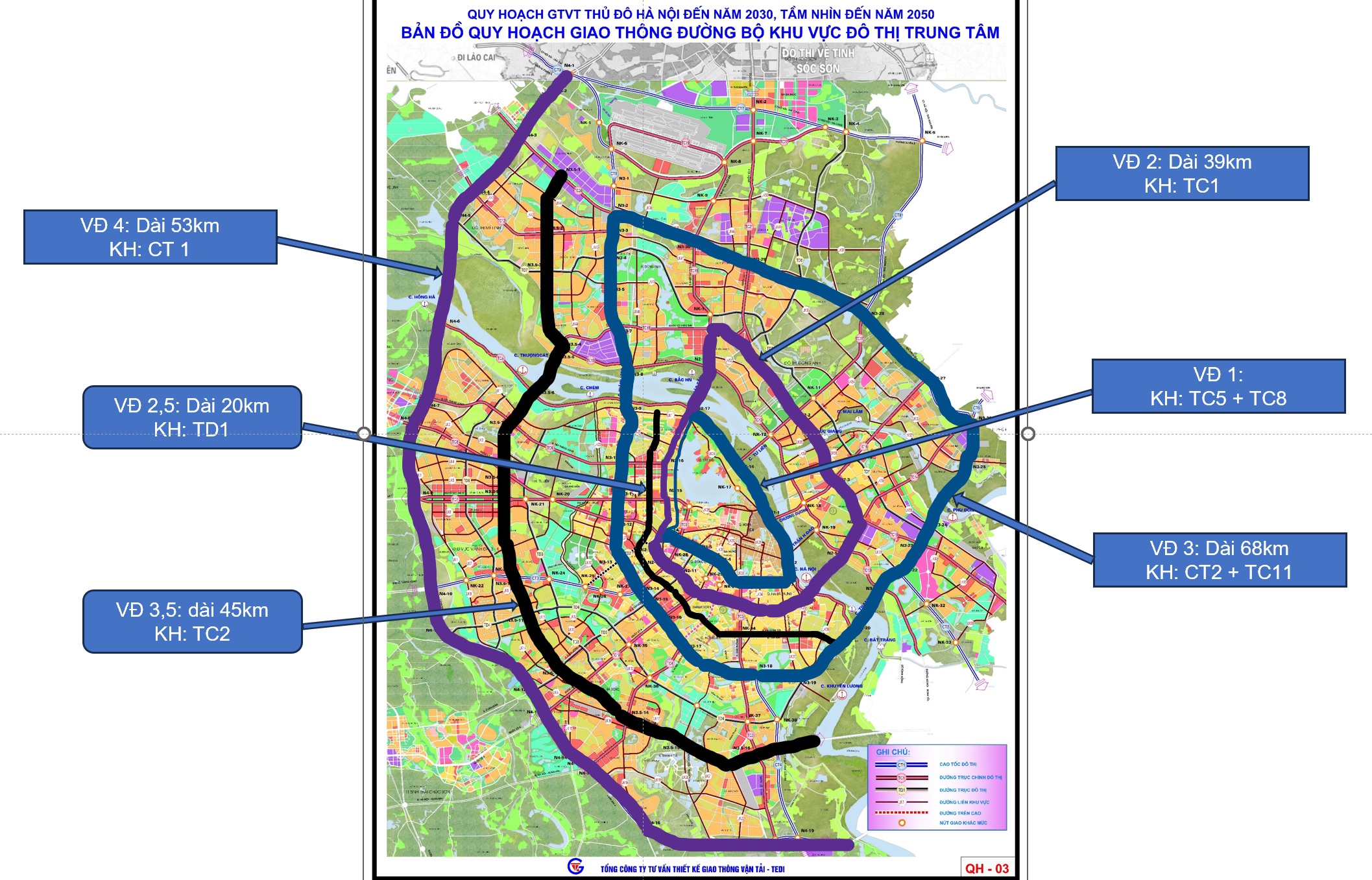 3. Đường vành đai 2.5: Ký hiệu TD1, chiều dài 20km, đi qua Lĩnh Nam – Kim Đồng – Định Công – Nguyễn Trãi – Yên Hòa – Xuân Đỉnh – Phú Thượng.
