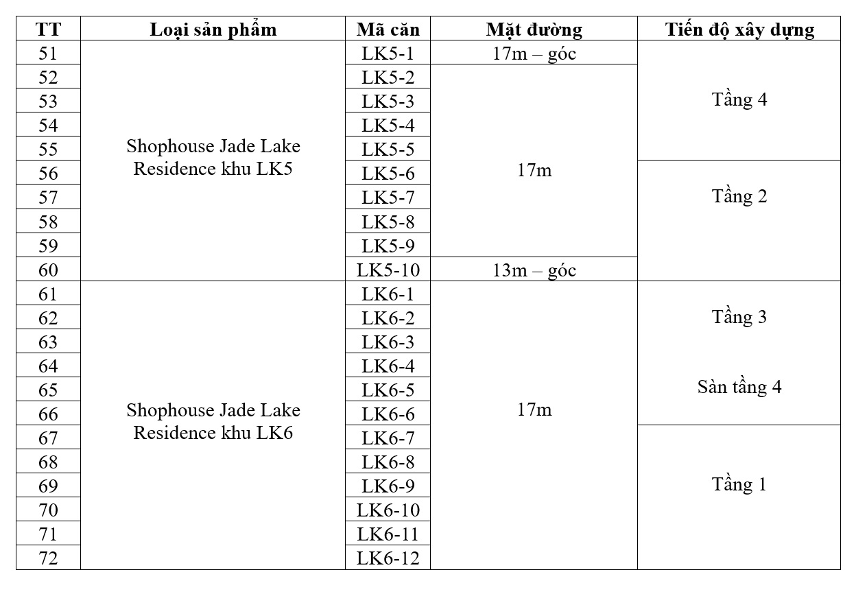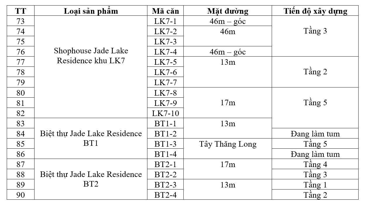 Dự án Jade Lake Residence các Block LK5,6,7 và BT2