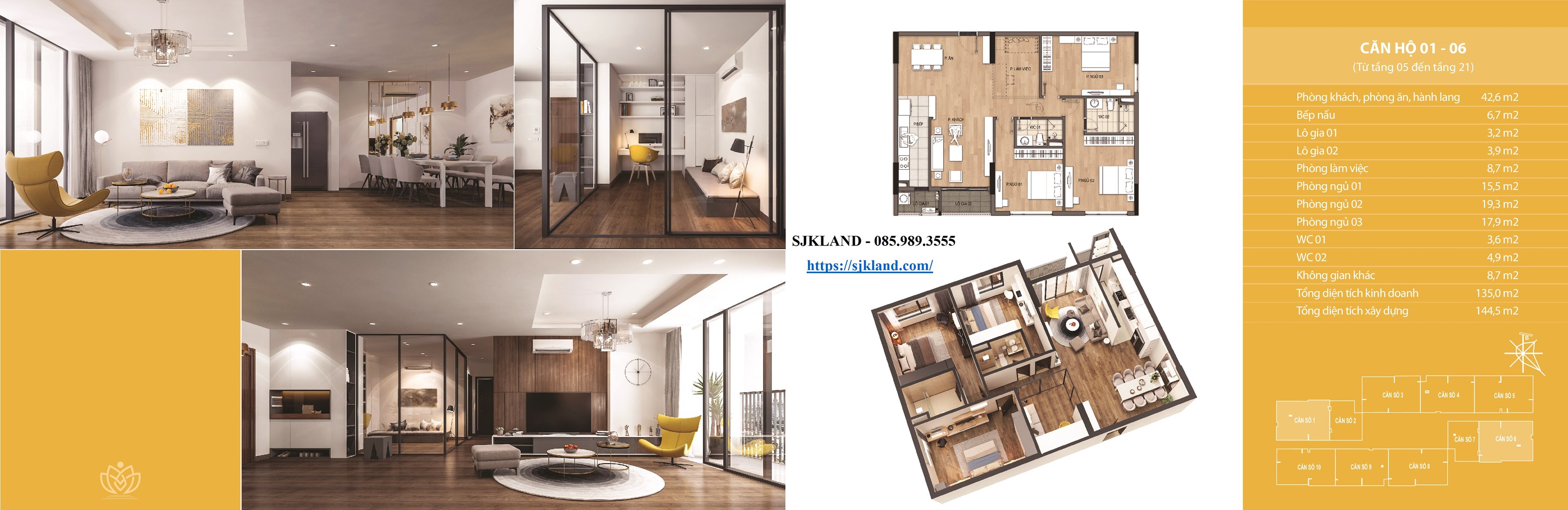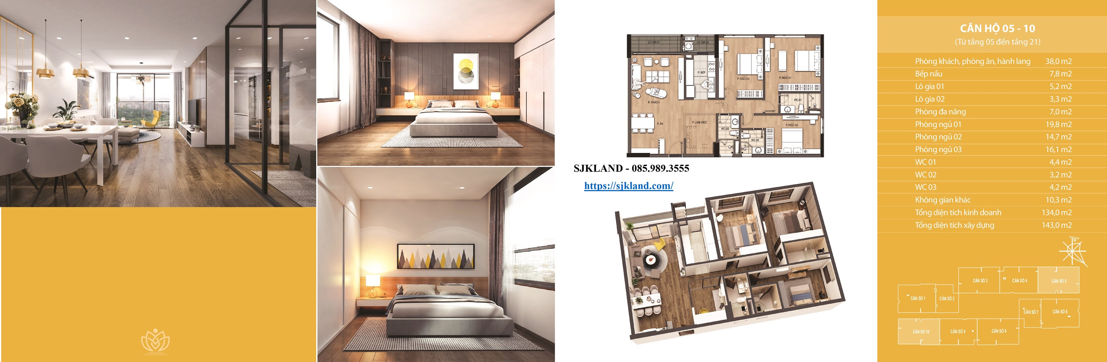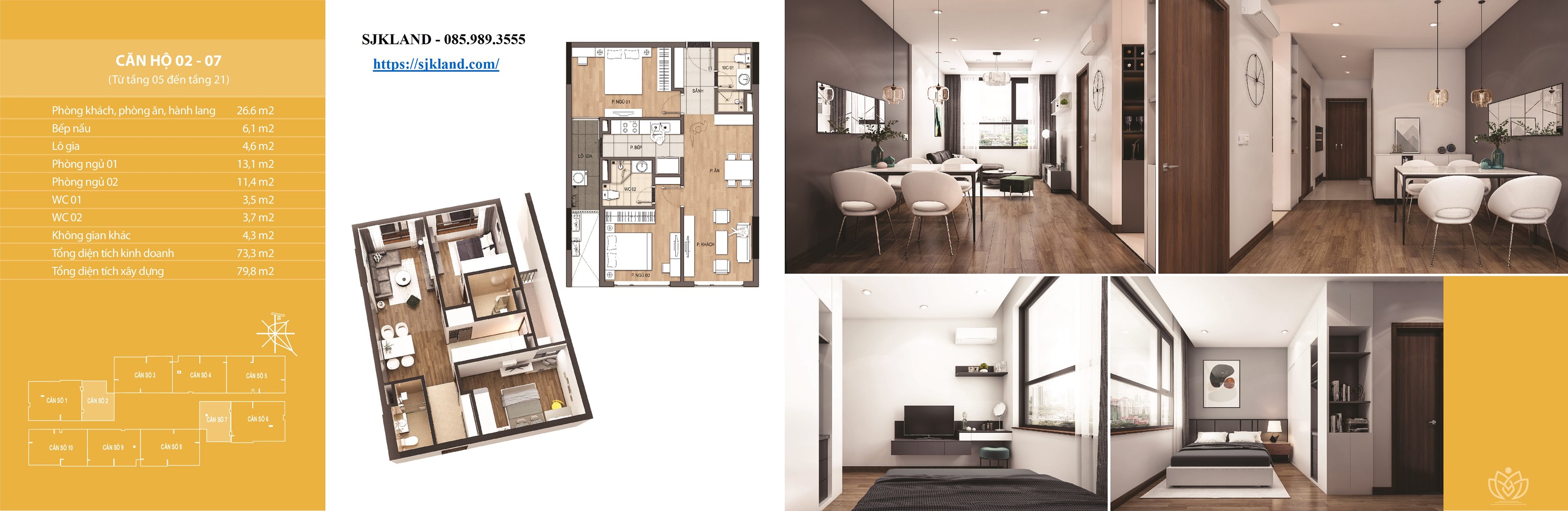 Mỗi tầng gồm 10 căn hộ chia làm căn dạng 02 ngủ và căn dạng 03 ngủ hoặc 03 ngủ + 01 đa năng, diện tích 02 căn 73,3m2; 02 căn 121m2; 02 căn 134m2; 02 căn 135m2.