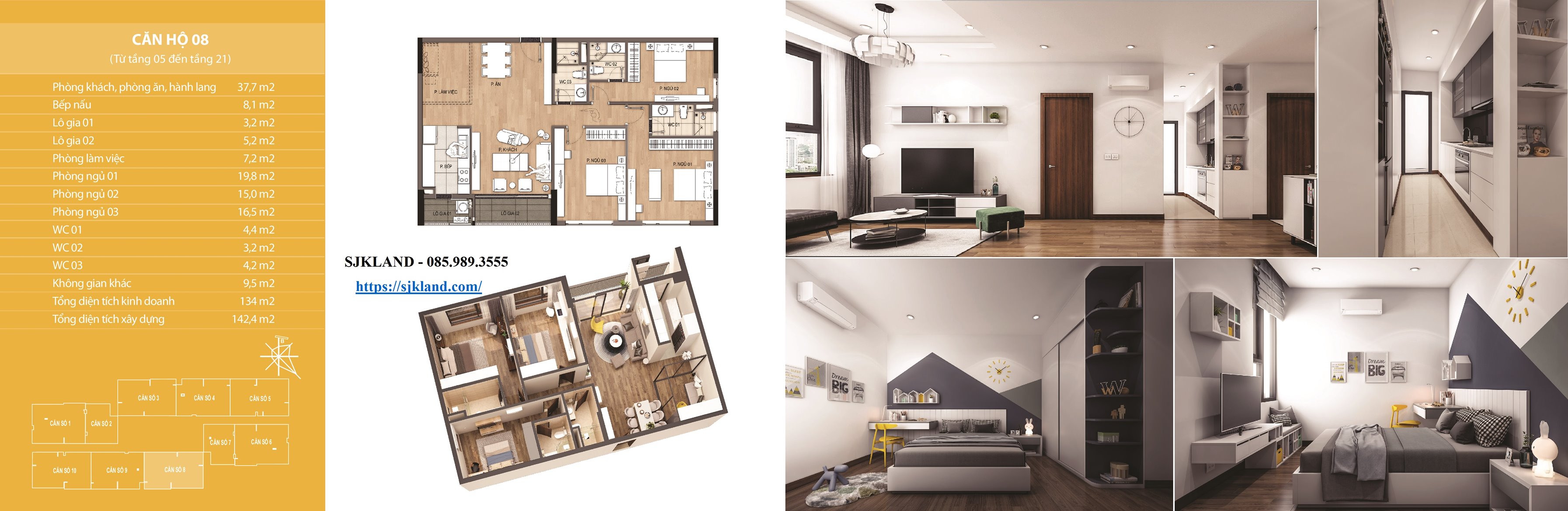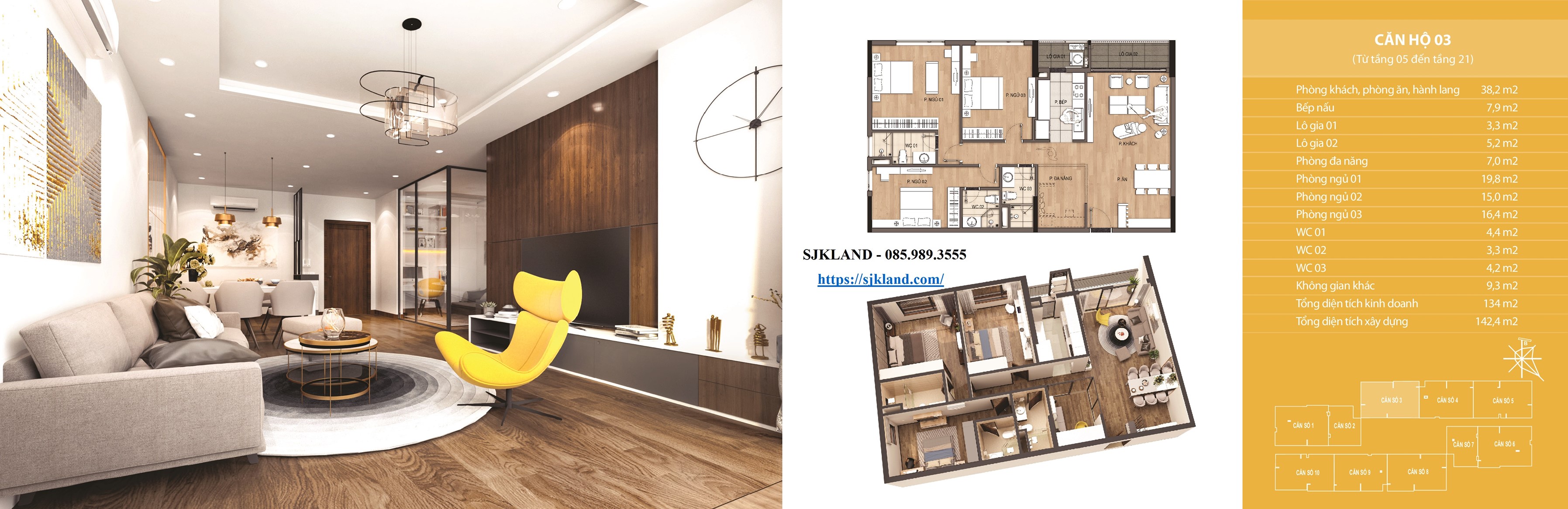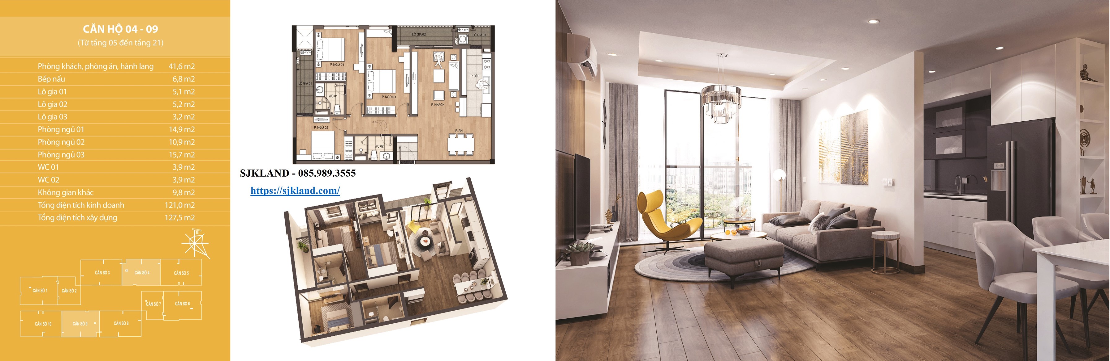 Mỗi tầng gồm 10 căn hộ chia làm căn dạng 02 ngủ và căn dạng 03 ngủ hoặc 03 ngủ + 01 đa năng, diện tích 02 căn 73,3m2; 02 căn 121m2; 02 căn 134m2; 02 căn 135m2.