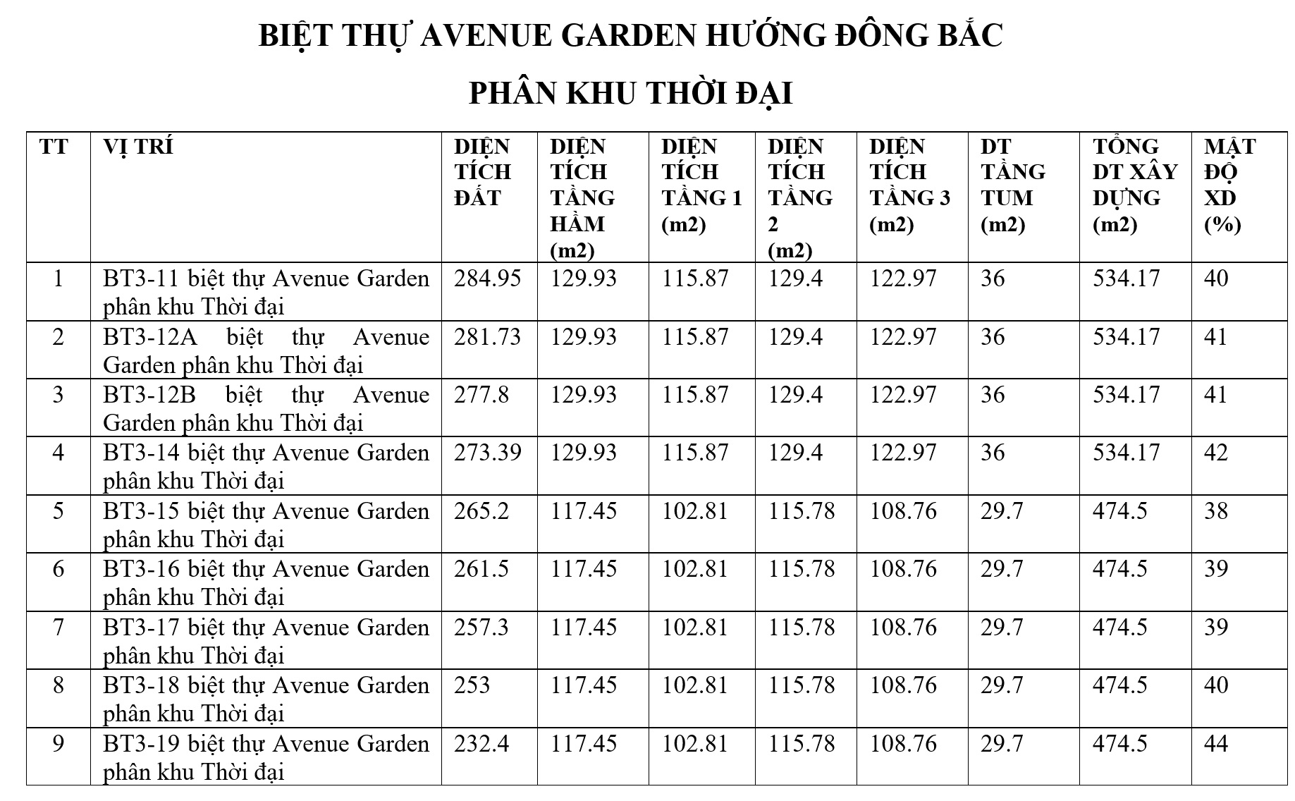 Biệt thự, shophouse Avenue Garden nằm trong phân khu Thời đại có diện tích đất 15.284m2 diện tích xây dựng toàn phân khu là 6.973m2, mật độ xây dựng 45.6%. Số lượng căn có 63 căn, trong đó biệt thự có 23 căn. Diện tích bé nhất căn BT3-20 là 206m2; căn diện tích lớn nhất BT3-11 là 284.95m2. Các căn gồm các hướng tây nam và đông bắc, đường nội khu 12.5m, trừ một số căn góc.