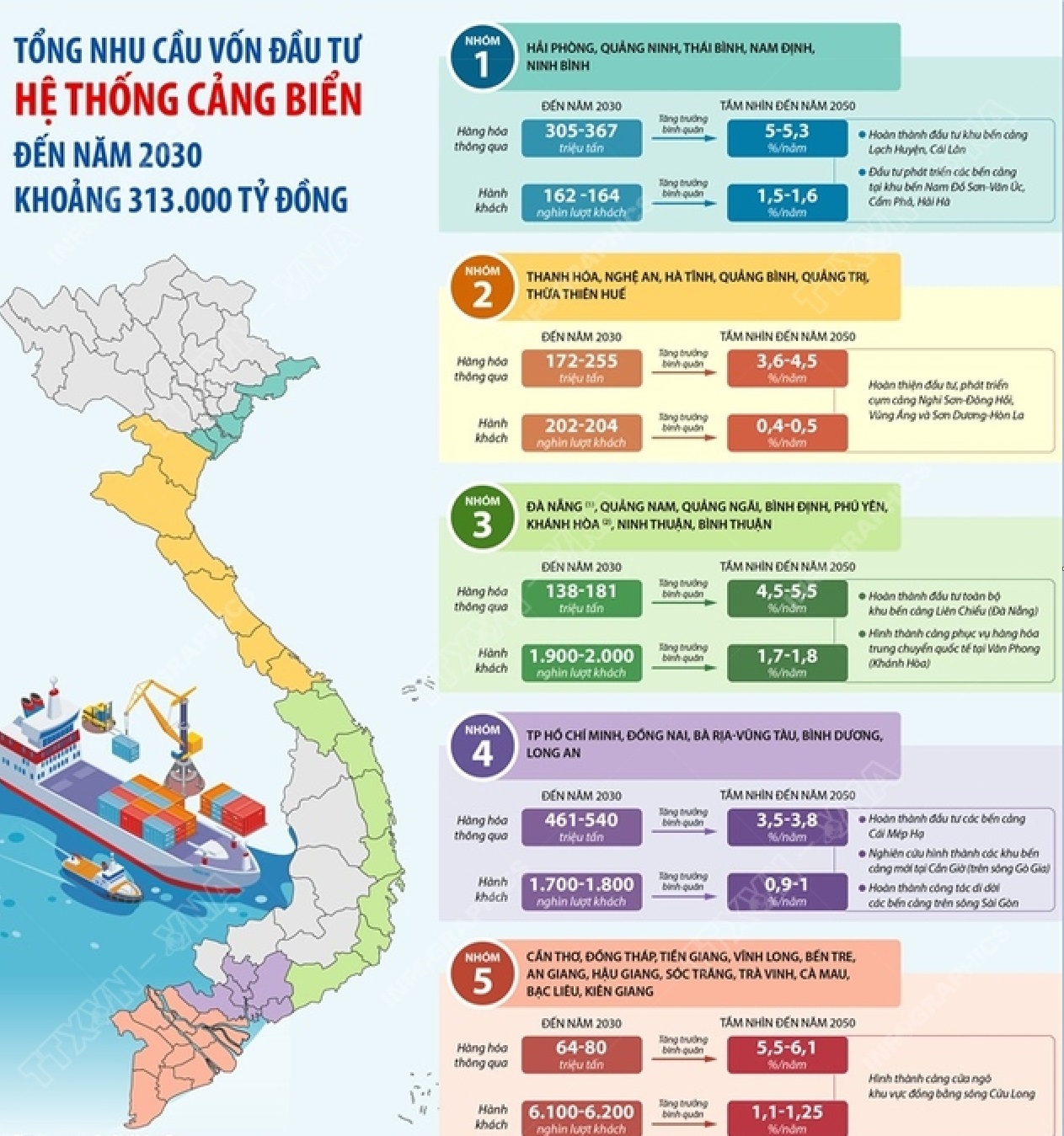 + Vùng biển và ven biển Đông Nam Bộ (Bà Rịa – Vũng Tàu – TP Hồ Chí Minh): tập trung phát triển cảng Cái Mép – Thị Vải thực sự trở thành cảng trung chuyển quốc tế, gắn với hành lang kinh tế xuyên Á. Phát triển dịch vụ hậu cần cảng biển, dịch vụ bảo đảm an toàn hàng hải, công nghiệp khai thác, chế biến dầu khí, công nghiệp hỗ trợ và dịch vụ ngành dầu khí. Xây dựng các khu du lịch nghỉ dưỡng biển chất lượng cao.