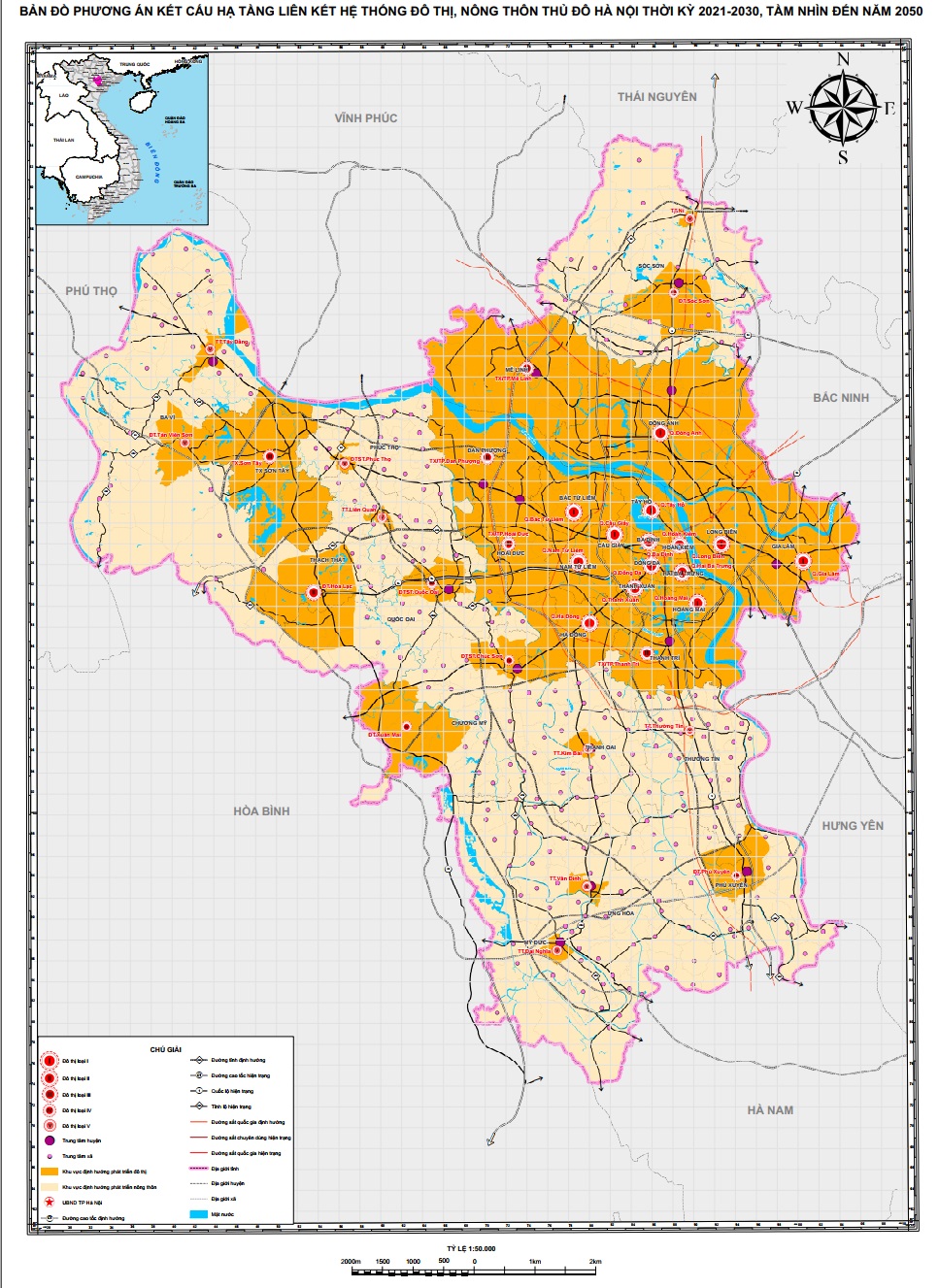 - Đô thị Hòa Lạc là một trung tâm đầu não về khoa học kỹ thuật, công nghệ cao, trung tâm đào tạo, giáo dục chất lượng cao. Là thành phố của những trung tâm nghiên cứu, các trường đại học, trung tâm thí nghiệm, nhấn mạnh công nghệ số, trí tuệ nhân tạo, ứng dụng và chuyển giao công nghệ đi cùng các chính sách hỗ trợ ưu tiên thu hút nhân lực chất lượng cao và doanh nghiệp đến đây làm việc và sinh sống. Diện tích tự nhiên 172,74km2, dân số năm 2030 khoảng 300.000 người, đô thị loại II; năm 2050 khoảng 800.000 người, đô thị loại I. Đầ tư các cơ sở trọng tâm là đại học quốc gia Hà Nội và khu công nghệ cao Hòa Lạc; tiếp tục hoàn thiện Làng văn hóa – du lịch các dân tộc Việt Nam gắn với hồ Đồng Mô – Ngải Sơn và vùng du lịch Ba Vì – Viên Nam, phát triển hệ thống hạ tầng đô thị hiện đại và đồng bộ gắn với hệ sinh thái tự nhiên tại khu vực. Xây dựng hoàn thiện tuyến kết nối đại lộ Thăng Long, bổ sung tuyến kết nối Nam đại lộ Thăng Long, tuyến Hồ Tây – Ba Vì và tuyến đường sắt số 5, nối từ đô thị trung tâm ra Hòa Lạc để hỗ trợ kết nối nhanh, thường xyên cho đô thị Hòa Lạc. Có thể áp dụng mô hình thành phố trong thủ đô để tạo nên các cơ chế đặc thù, thúc đẩy các dự án chiến lược tại Hòa Lạc được phát triển nhanh, tạo động lực cho phát triển kinh tế xã hội của Thủ đô và quốc gia.