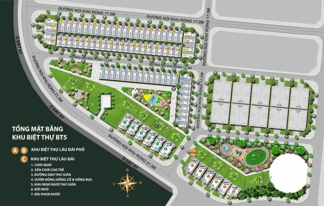 - BT5C - Green Center Villas: với 6 căn biệt thự, có diện tích 360 m2, nằm trên trục đường nội khu rộng 21,5 m.