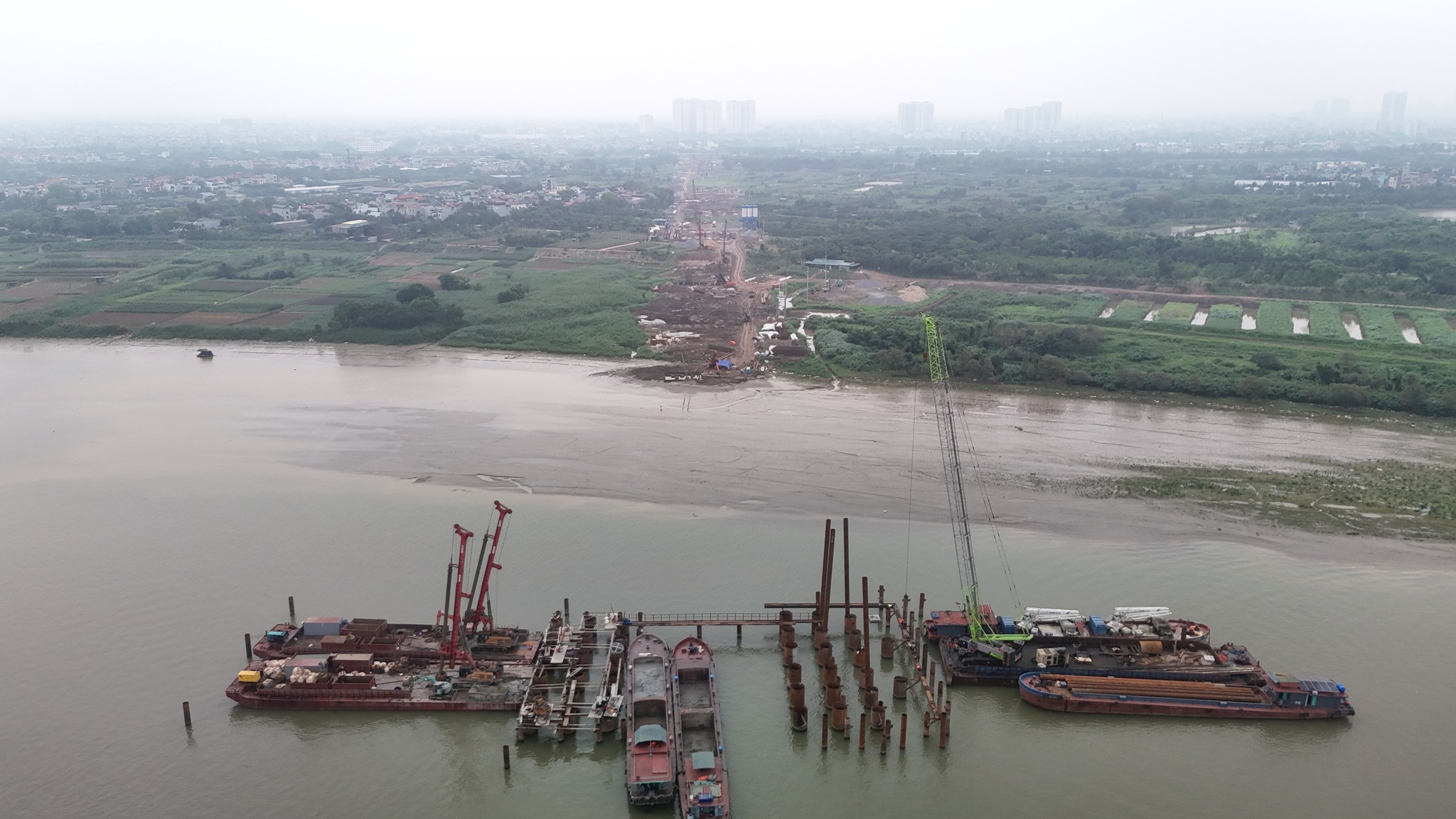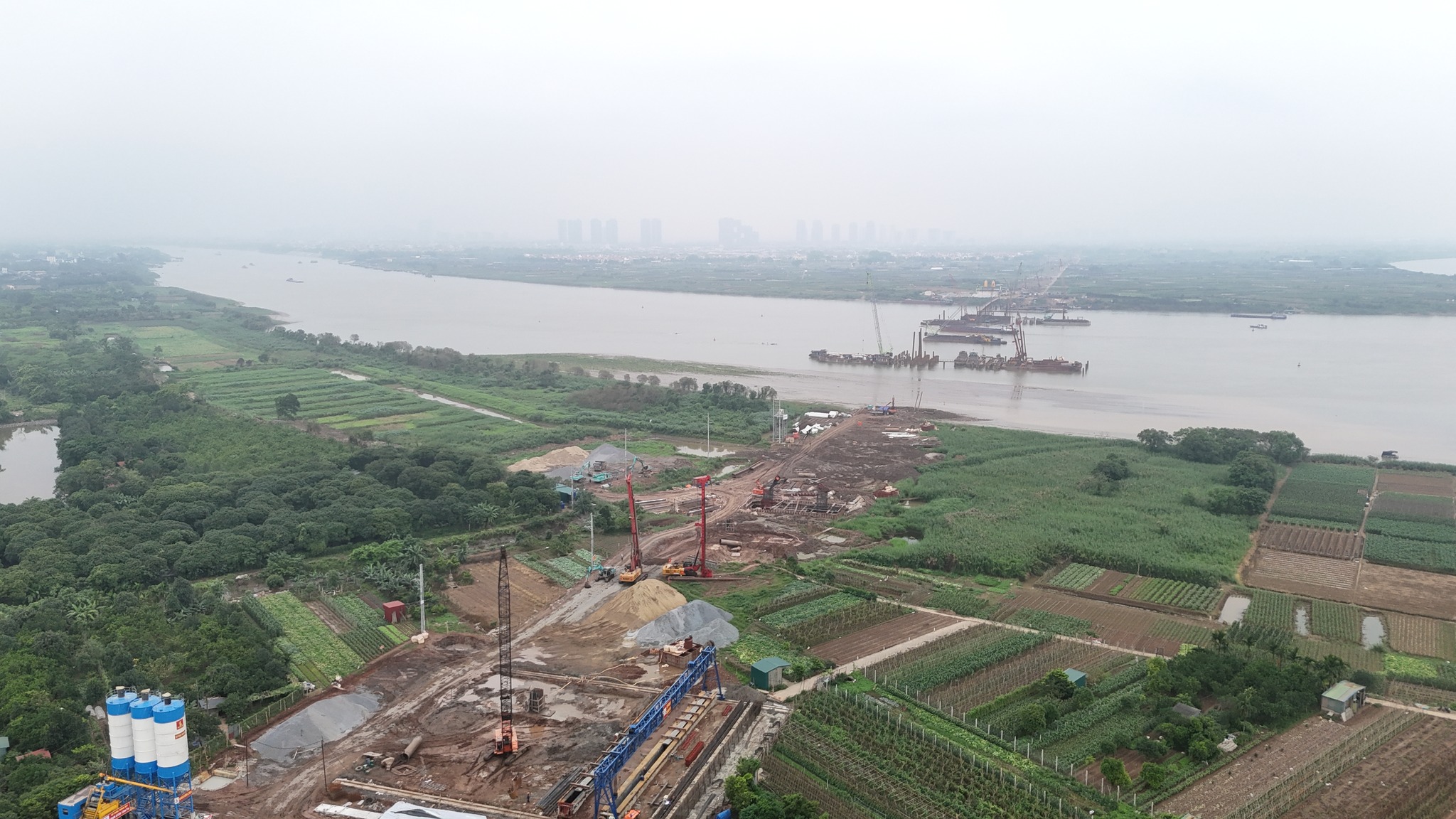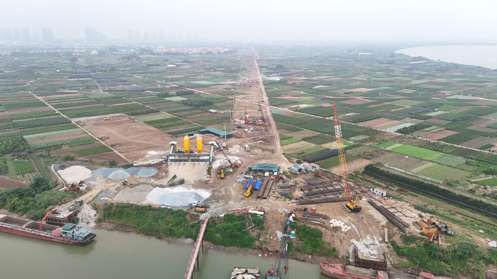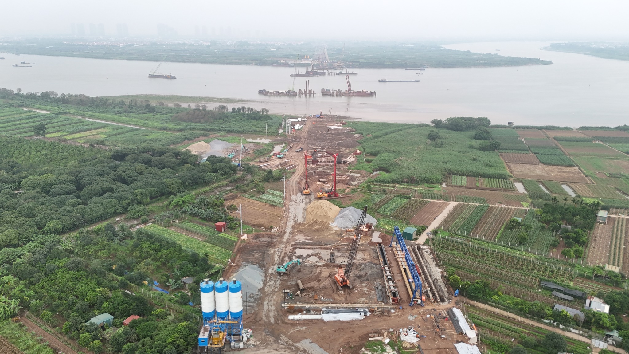 Phần cầu chính vượt sông Hồng đã thi công được 72/80 cọc khoan nhồi của trụ tháp chính, dự kiến hoàn thành toàn bộ trong tháng 4.2026