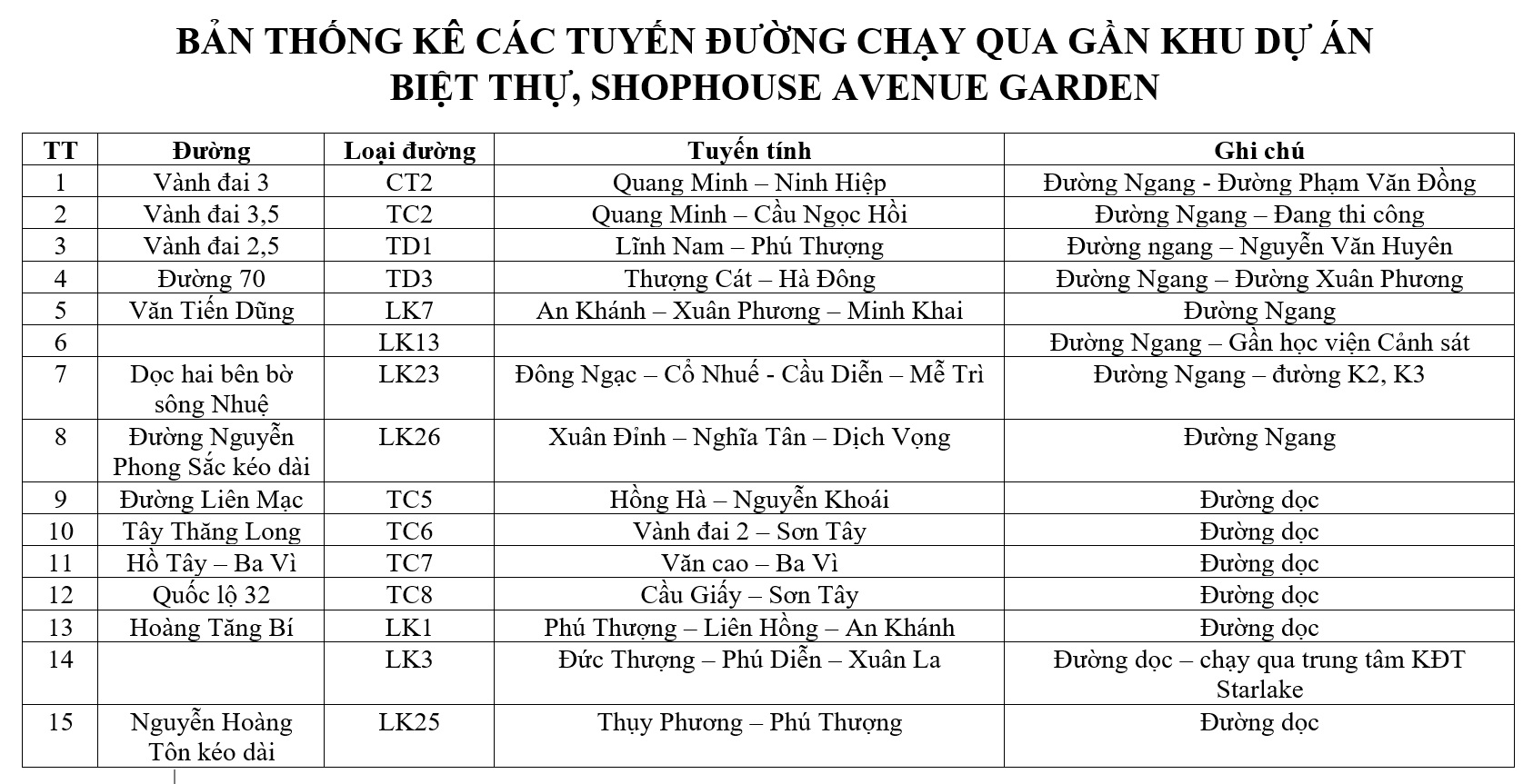 Quy hoạch tuyến đường đi qua khu đô thị Tây Tựu, cách dự án shophouse, biệt thự Avenue Garden vào khoảng 400m về phía Bắc.