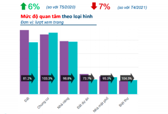 Cụ thể, so với tháng 4/2021, mức quan tâm đất nền giảm 19% chung cho toàn TT. Các tỉnh/thành có mức độ quan tâm giảm sâu nhất là Bắc Giang (49%), Bắc Ninh và Hà Nam (46%), Vĩnh Phúc (38%), Đà Nẵng (36%), Quảng Nam (35%).