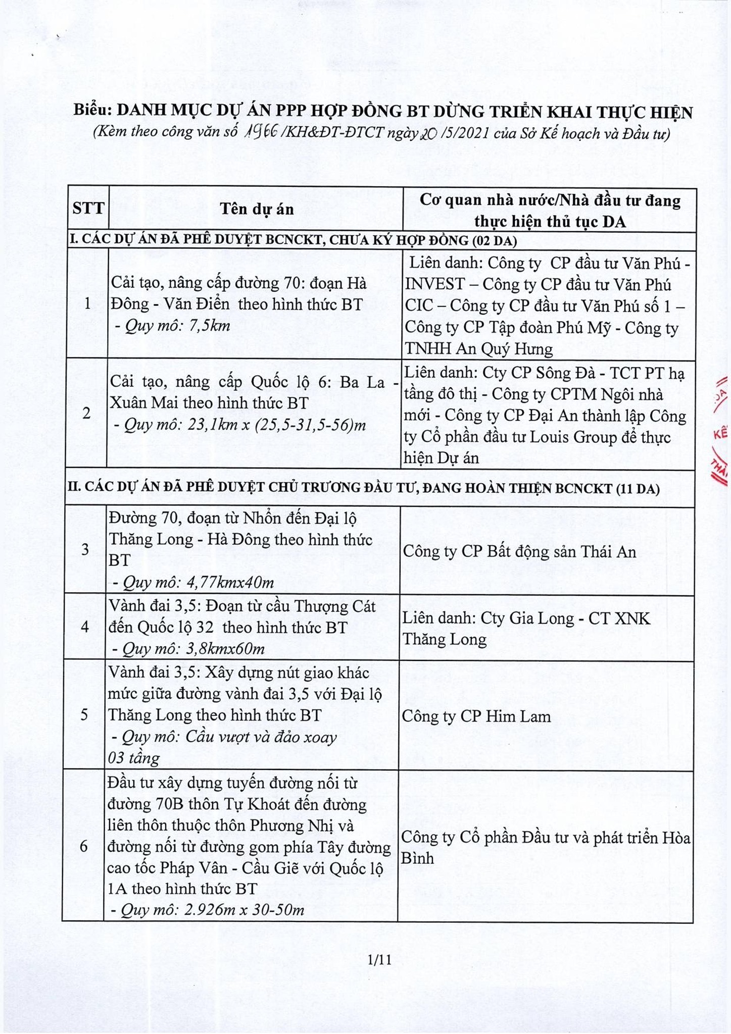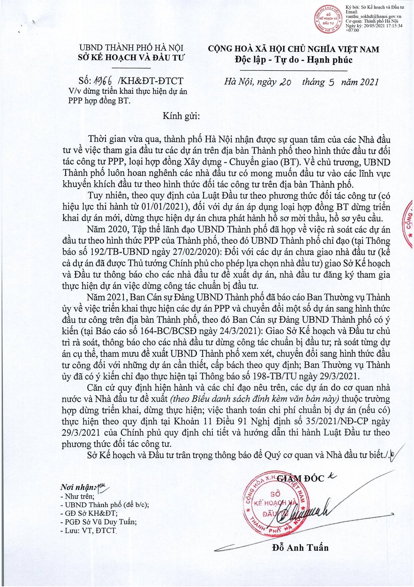 Theo Công văn 1966/KH&ĐT-ĐTCT ngày 20/5/2021 của sở Kế hoạch và Đầu tư thành phố Hà Nội về việc dừng triển khai thực hiện dự án PPP hợp đồng BT.