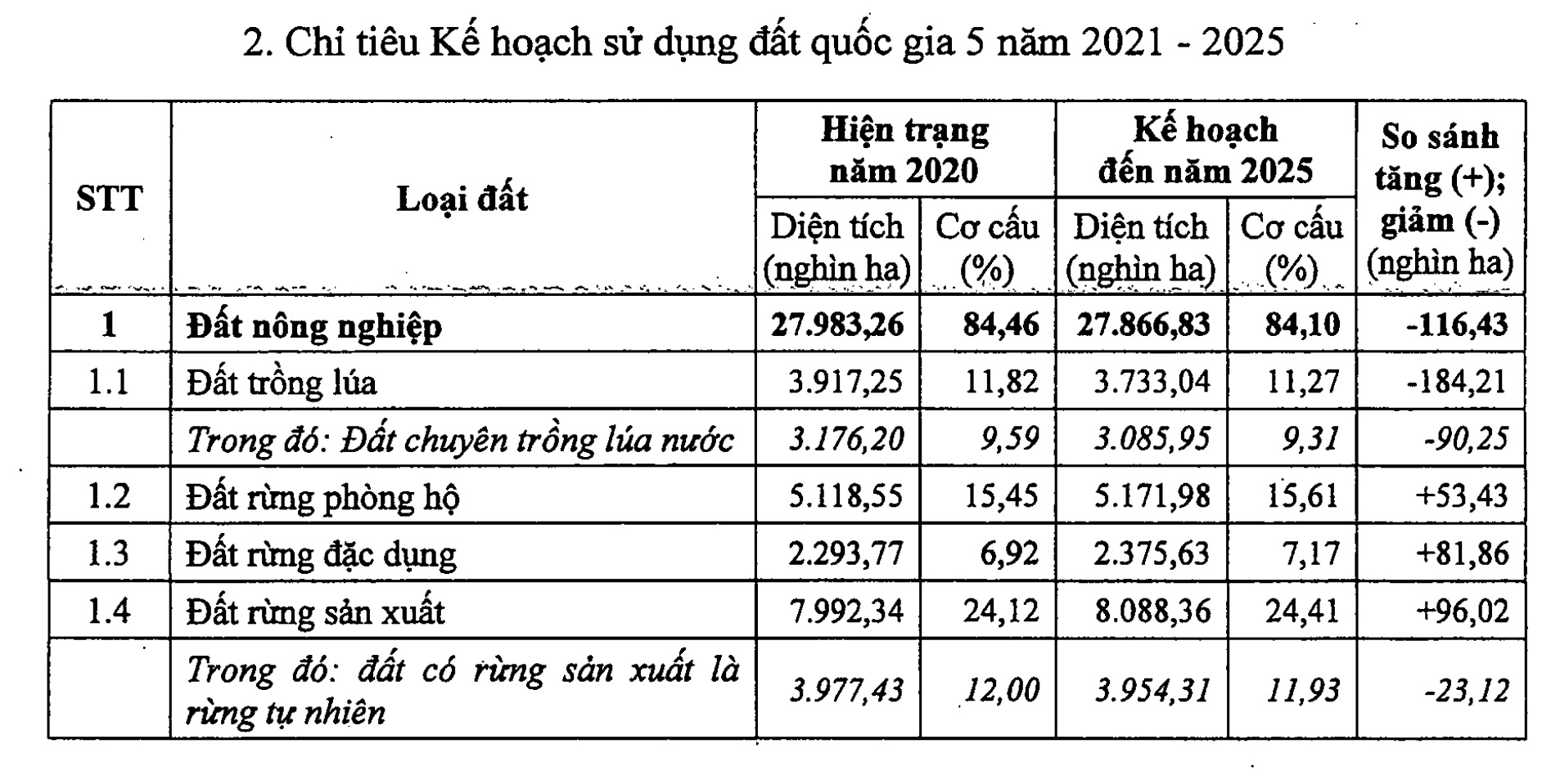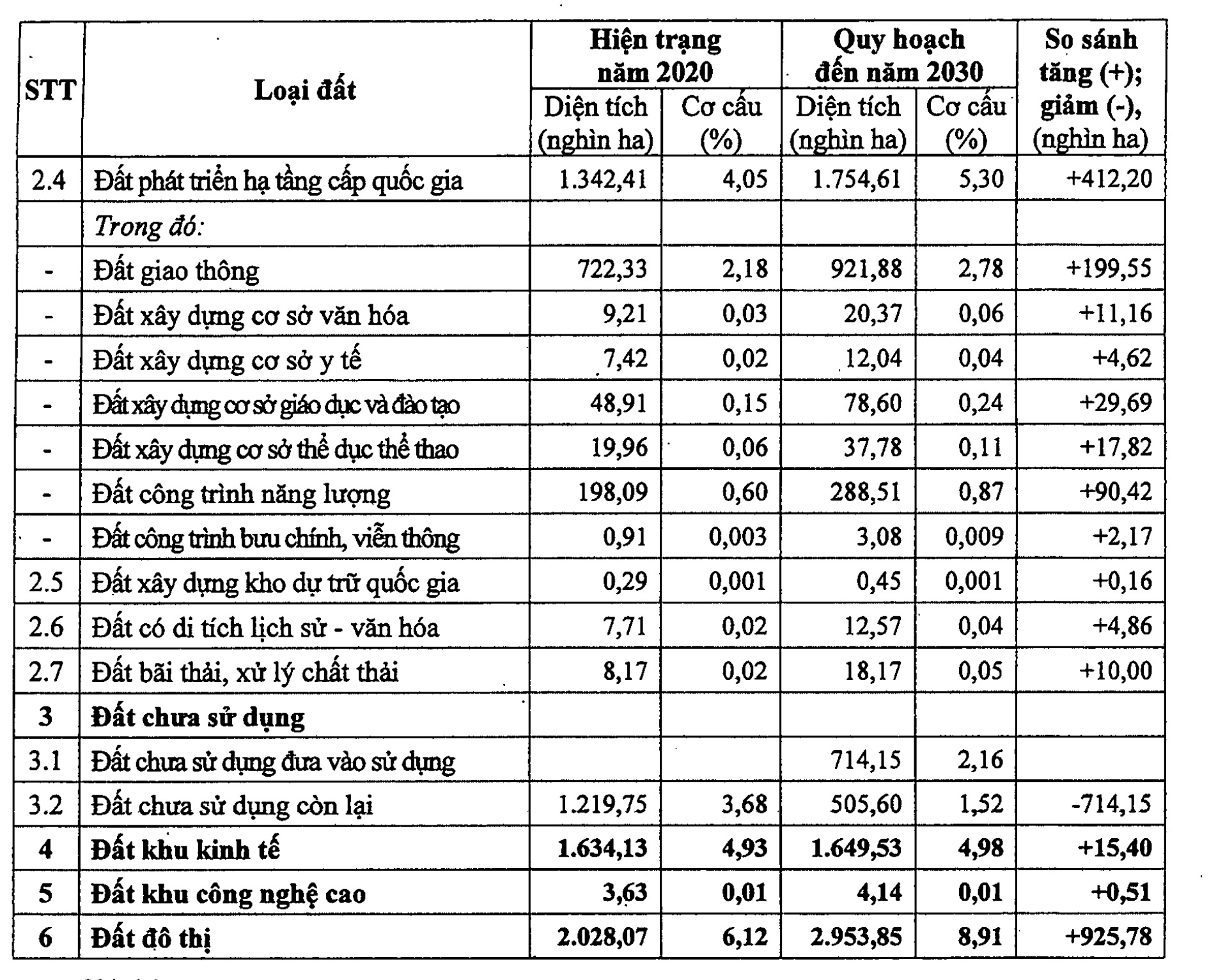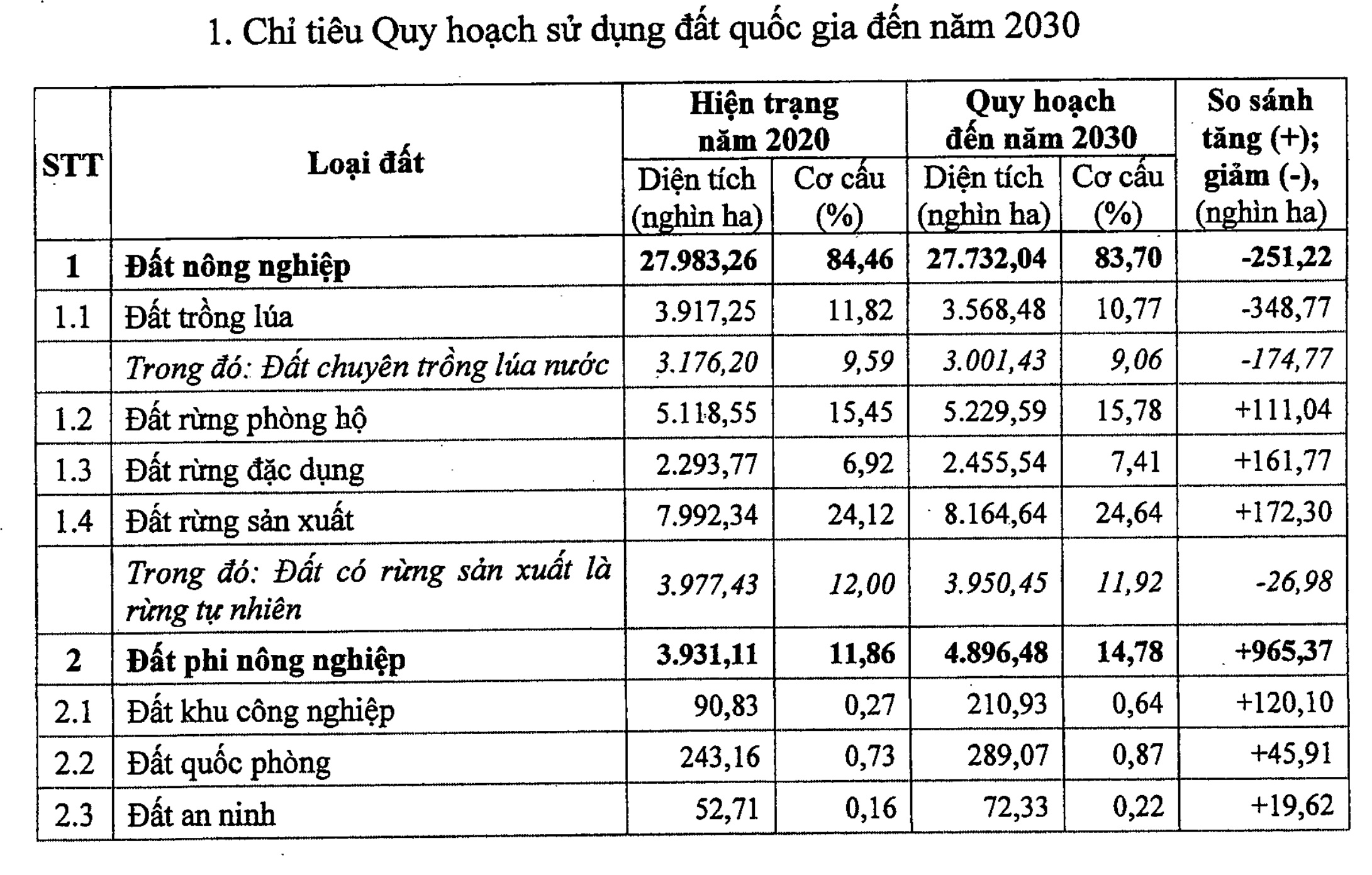 - Bố trí quỹ đất đáp ứng yêu cầu phát triển hệ thống kết cấu hạ tầng đồng bộ, bảo đảm kết nối không gian phát triển liên ngành, liên vùng, các hành lang kinh tế và các vùng động lực phát triển của quốc gia; giữ ổn định 3,5 triệu ha đất trồng lúa; bảo đảm tỷ lệ che phủ rừng ổn định ở mức 42-43%;