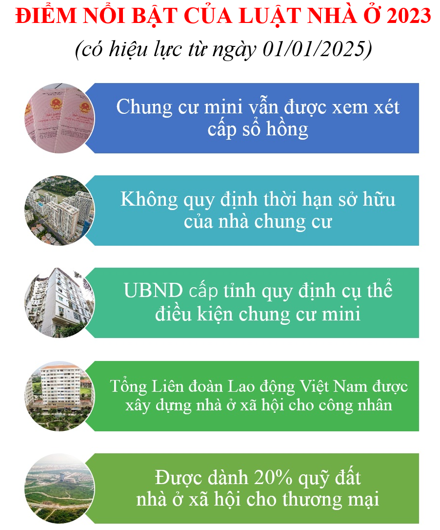 Quốc hội chính thức thông qua Luật Nhà ở vào ngày 27/11/2023, có hiệu lực thi hành vào ngày 1/1/2025. Thông qua đó nhiều nội dung quan trọng đã được sửa đổi bổ sung trên nền tảng luật Nhà ở năm 2014. Một số nội dung mới: