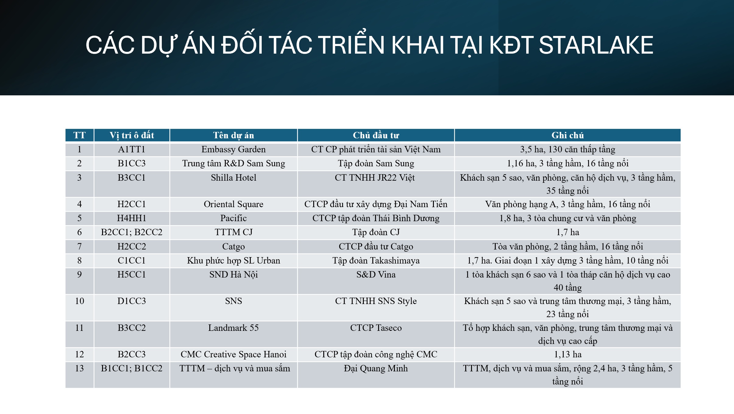 Starlake với 186,3 ha vừa là nơi cư trú của 24.300 cư dân, vừa là trung tâm hành chính quốc gia mới, nơi đặt trụ sở của 13 bộ ngành trung ương vừa là nơi làm việc của loạt doanh nghiệp, tập đoàn lớn của Việt Nam và thế giới, nơi có các trung tâm thương mại, khách sạn, trường học đẳng cấp quốc tế, là trung tâm kết nối hàng loạt khu đô thị như ngoại giao đoàn, ciputra, thành phố giao lưu hay khu công nghệ cao sinh học hà nội tạo nên bức tranh hiện đại, sôi động hừng hực khí thế phát triển.