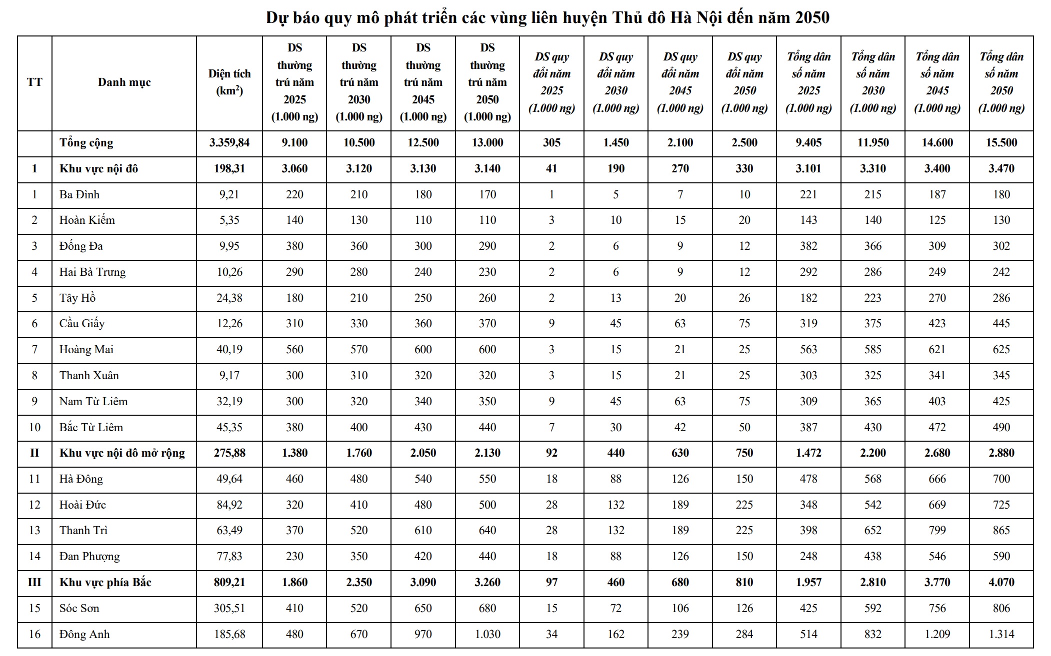 1- Khu vực nội đô:10 quận: Ba Đình, Hoàn Kiếm, Đống Đa, Hai Bà Trưng, Tây Hồ, Cầu Giấy, Hoàng Mai, Thanh Xuân, Nam Từ Liêm, Bắc Từ Liêm, diện tích: 198,31 km2, dân số 2022: 2,98 triệu, năm 2030 khoảng 3,31 triệu (dân số thường trú – 3,12 triệu, dân số quy đổi 190 nghìn), năm 2050 khoảng 3,47 triệu (thường trú 3,14 triệu, dân số quy đổi 330 nghìn).