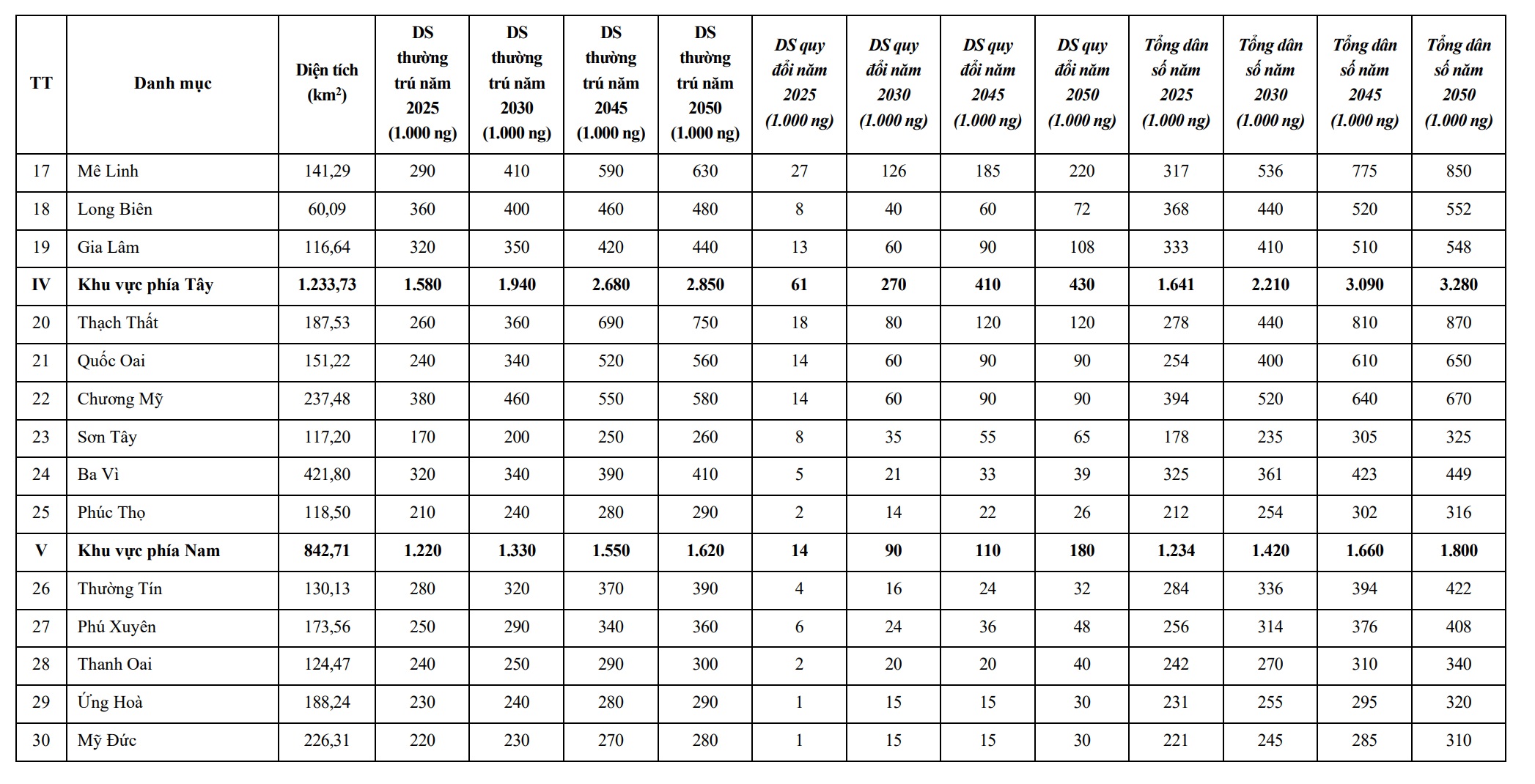4- Khu vực phía Tây: 6 huyện: Thách Thất, Quốc Oai, Chương Mỹ, Sơn Tây, Ba Vì, Phúc Thọ, diện tích: 1.233,73km2, dân số năm 2022 khoảng 1,44 triệu, năm 2030 dân số khoảng 2,21 triệu (dân số thường trú 1,94 triệu, dân số quy đổi 270 nghìn), năm 2050 tổng dân số 3,28 triệu (dân số thường trú 2,85 triệu người, dân sô quy đổi 430 nghìn.