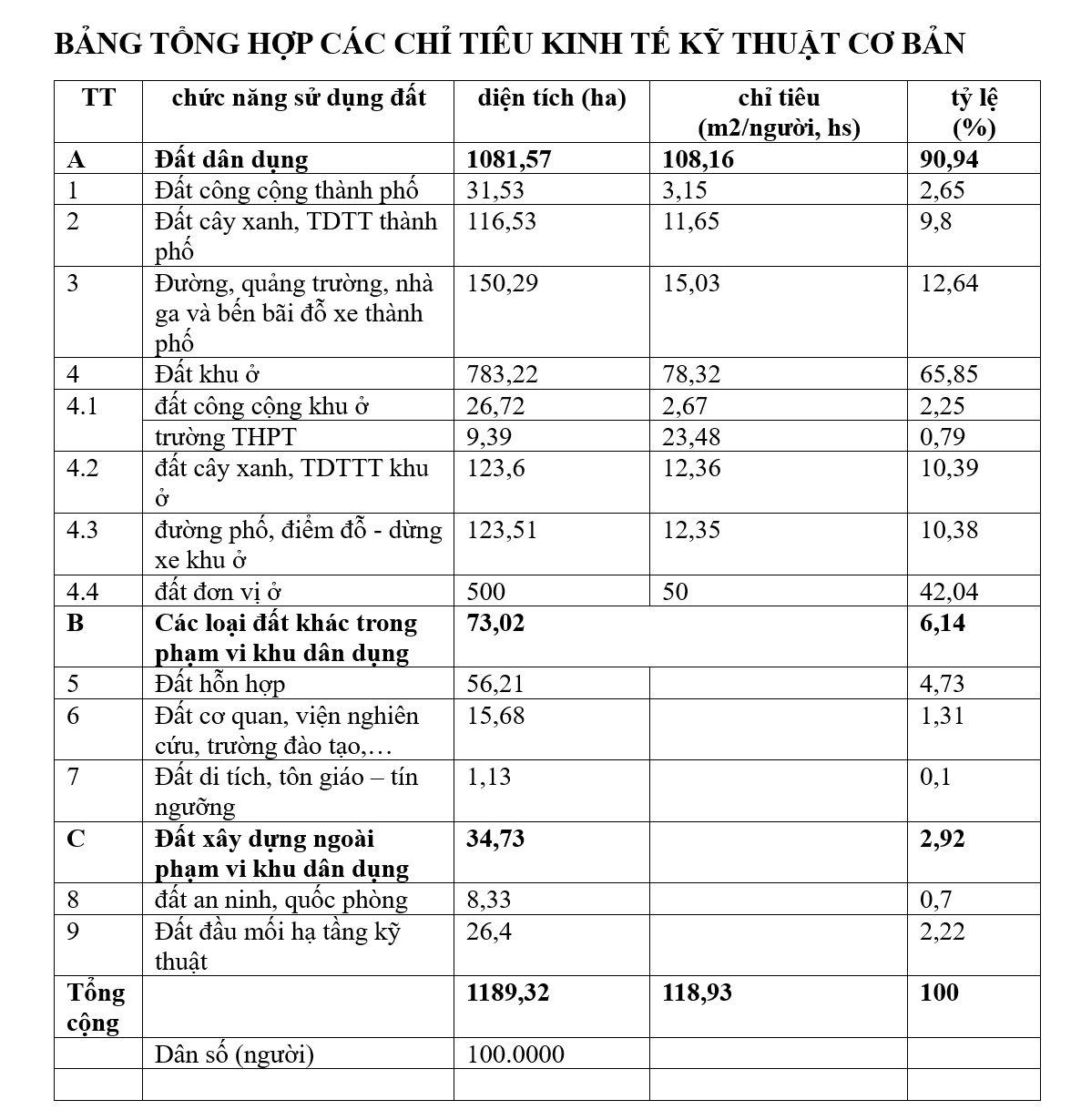 Diện tích đất giao thông cấp khu vực trở lên: 273.8 ha