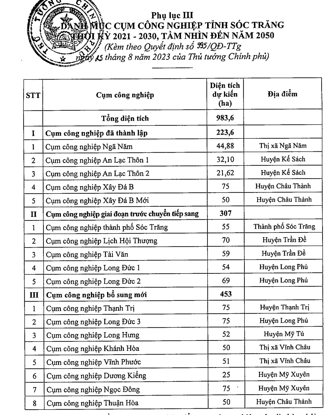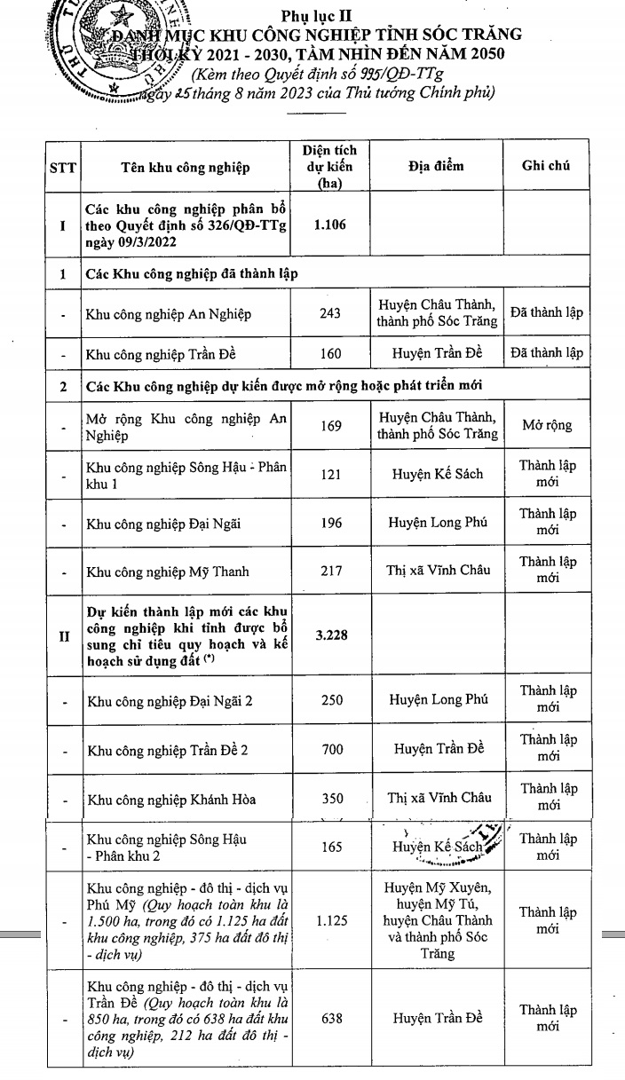 - Cụm công nghiệp: Mỗi đơn vị cấp huyện có ít nhất 01 cụm công nghiệp; trừ huyện Cù Lao Dung; quy hoạch mới 08 cụm, đưa tổng số cụm trên địa bàn lên 18 cụm.