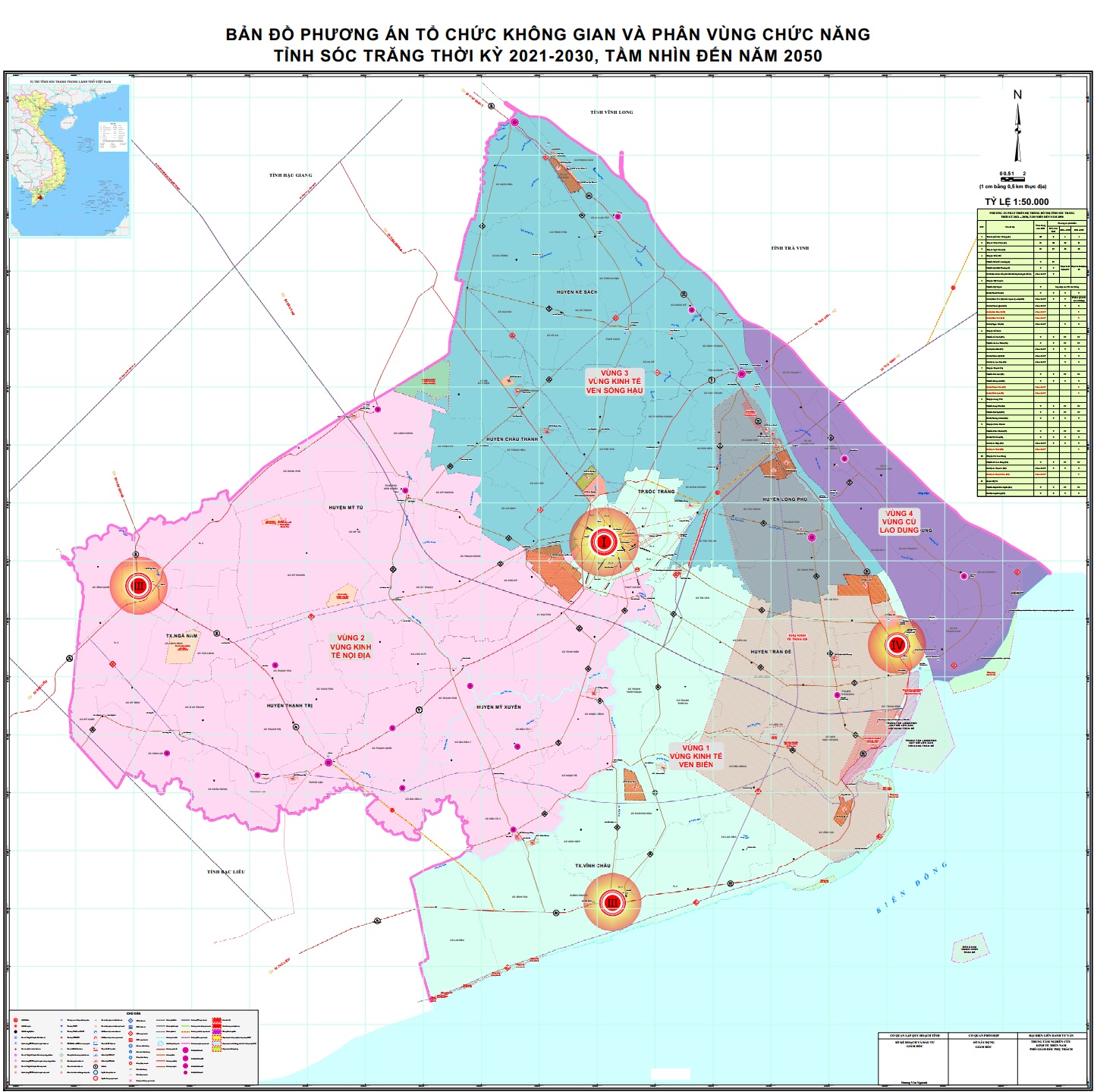 + Vùng huyện Trần Đề: xây dựng hạ tầng kỹ thuật đô thị đạt tiêu chí đô thị loại IV gắn kết với thành phố Sóc Trăng và dọc sông Hậu. Hình thành cảng biển cửa ngõ Trần Đề; nghiên cứu phát triển các khu công nghiệp, trung tâm logistics, khu chức năng dịch vụ hậu cần cảng.