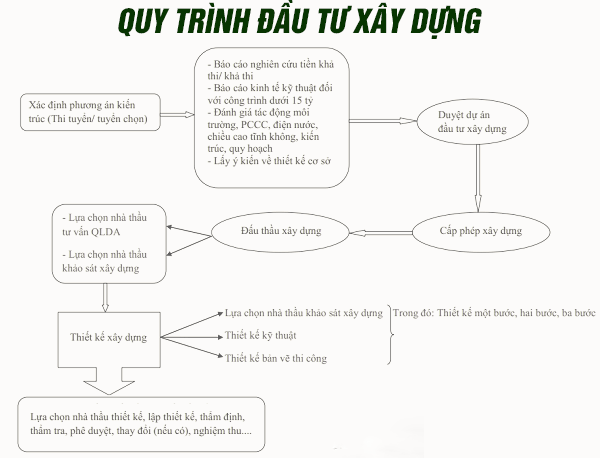 Quy trình có thể chia thành hai giai đoạn thực hiện: Giai đoạn chuẩn bị đầu tư xây dựng và giai đoạn thực hiện đầu tư xây dựng, cùng 10 bước cụ thể, như sau: