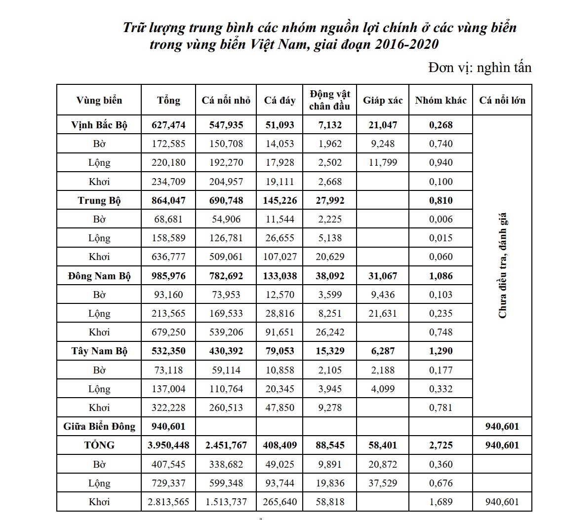 - Tài nguyên thủy sản: nguồn lợi thủy sản đã bắt gặp: 1.385 loài thủy sàn, thuộc 614 giống, 237 họ, 47 bộ. Trữ lượng trung bình các nhóm nguồn lợi thủy sản chủ yếu ước khoảng 4,36 triệu tấn.