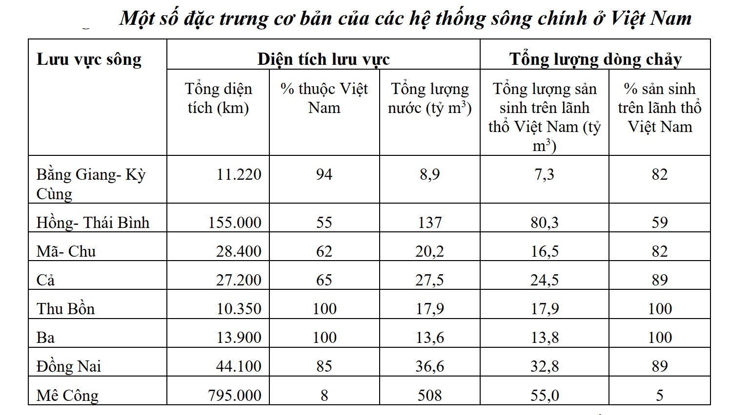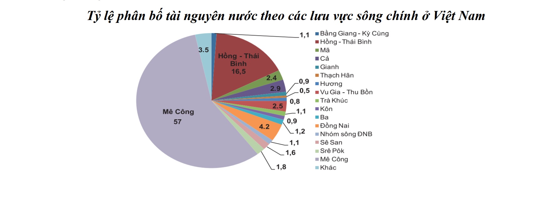 - Nước mặt: Việt Nam có 106 lưu vực sông, khoảng 3.450 sống, suối có chiều dài từ 10km trờ lên. Là quốc gia có nguồn tài nguyên nước dồi dào. Tổng lượng nước bình quân đầu người vào khoảng 9.434m3/người/năm, tuy nhiên nguồn phụ thuộc nhiều vào nước ngoài. 60% lượng nước tập trung ở lưu vực sông Mê Công, 16% tập trung ở Lưu vực sông Hồng – Thái Bình.