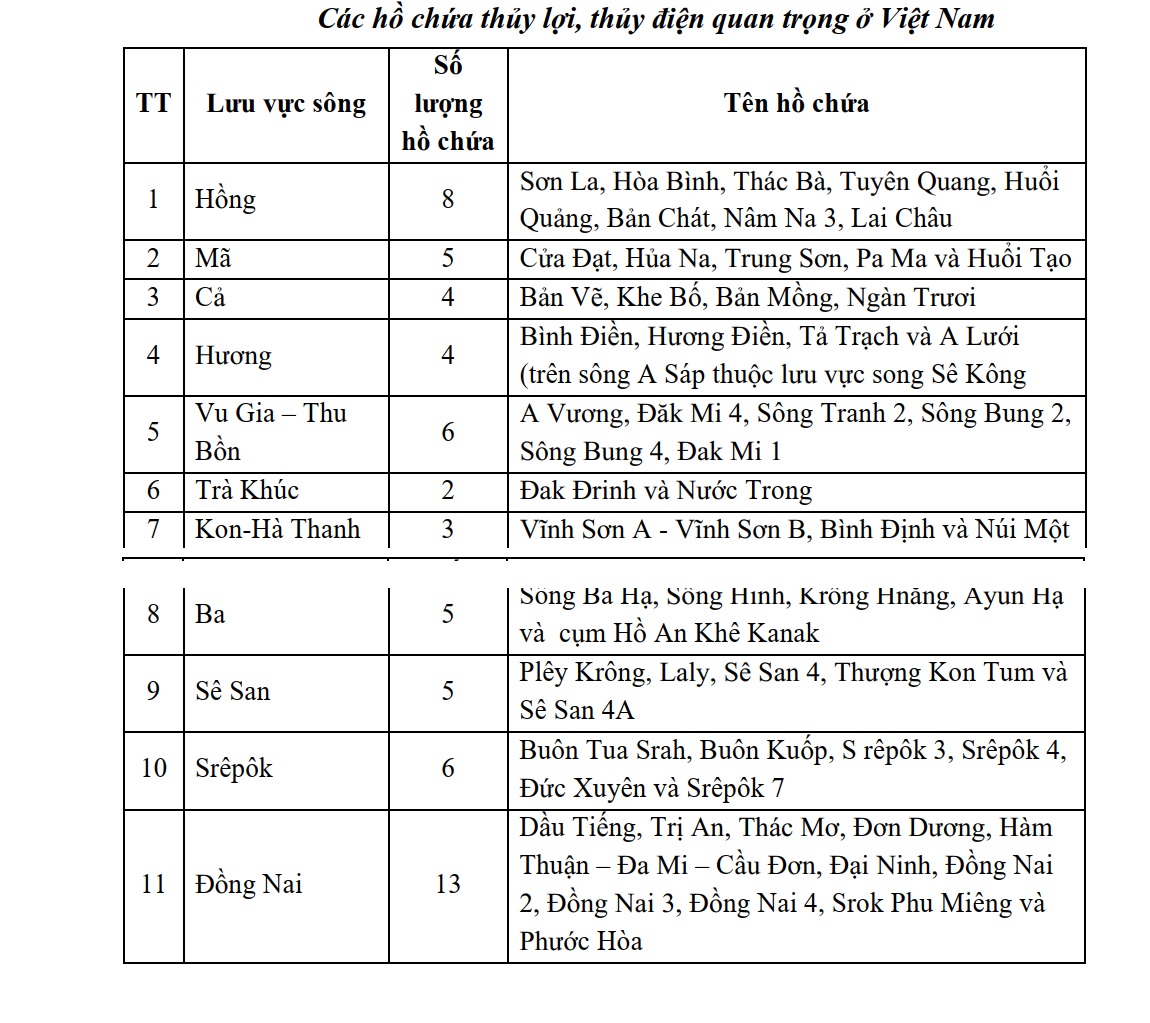 - Hệ thống hồ chứa: cả nước có 7.160 hồ chứa thủy lợi, thủy điện, trong đó có 2.300 hồ có dung tích từ 0,2 triệu m3 trở lên.