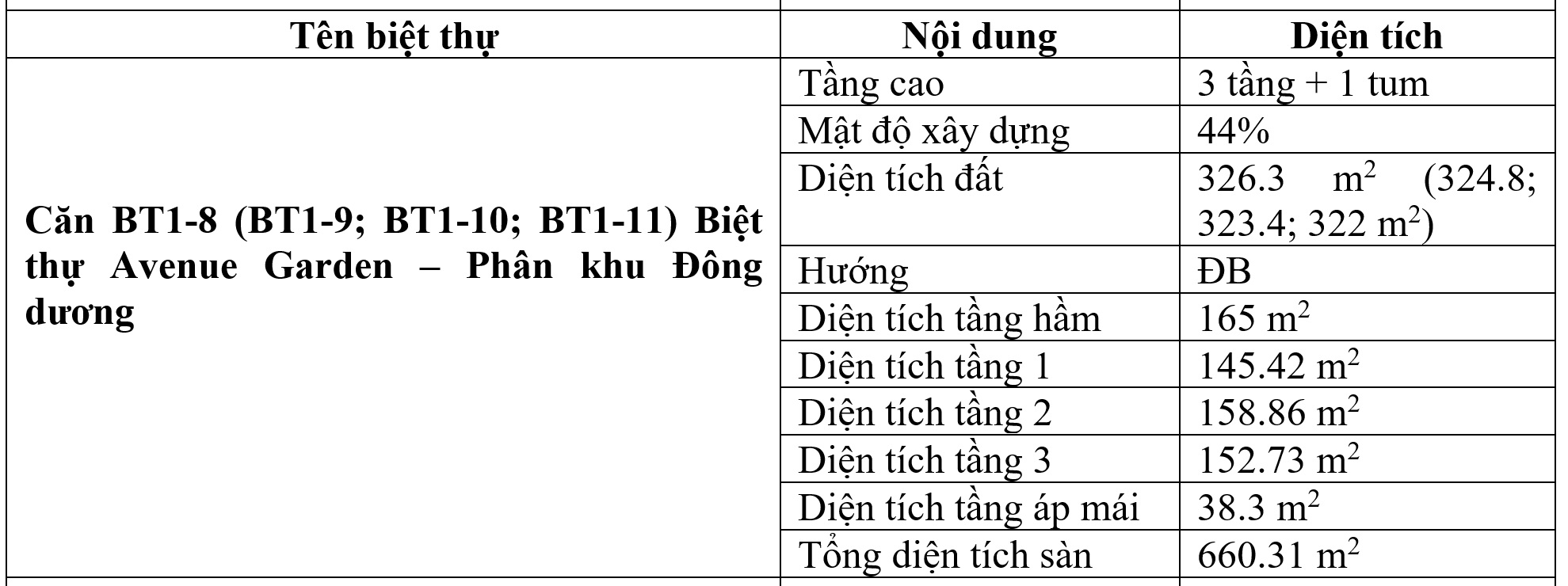 Bảng diện tích đất các căn biệt thự Avenue Garden – Phân khu Đông dương