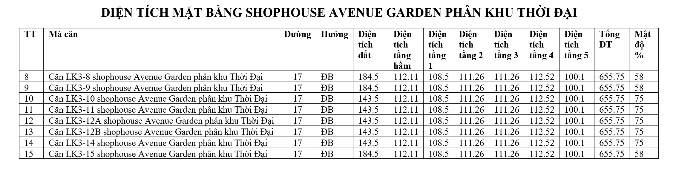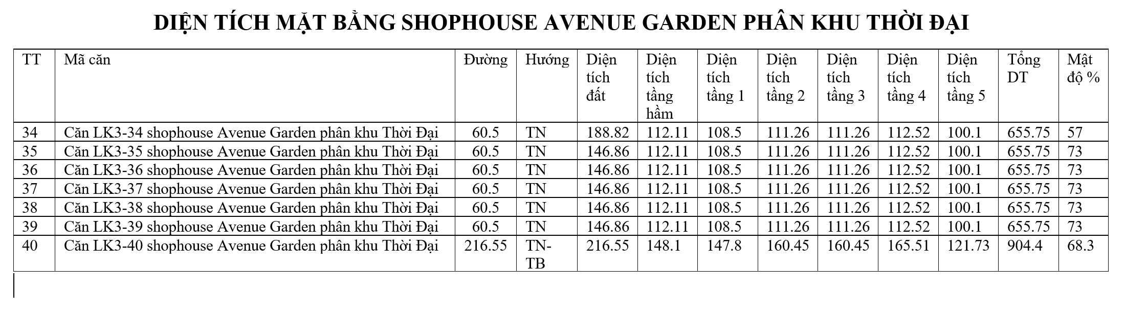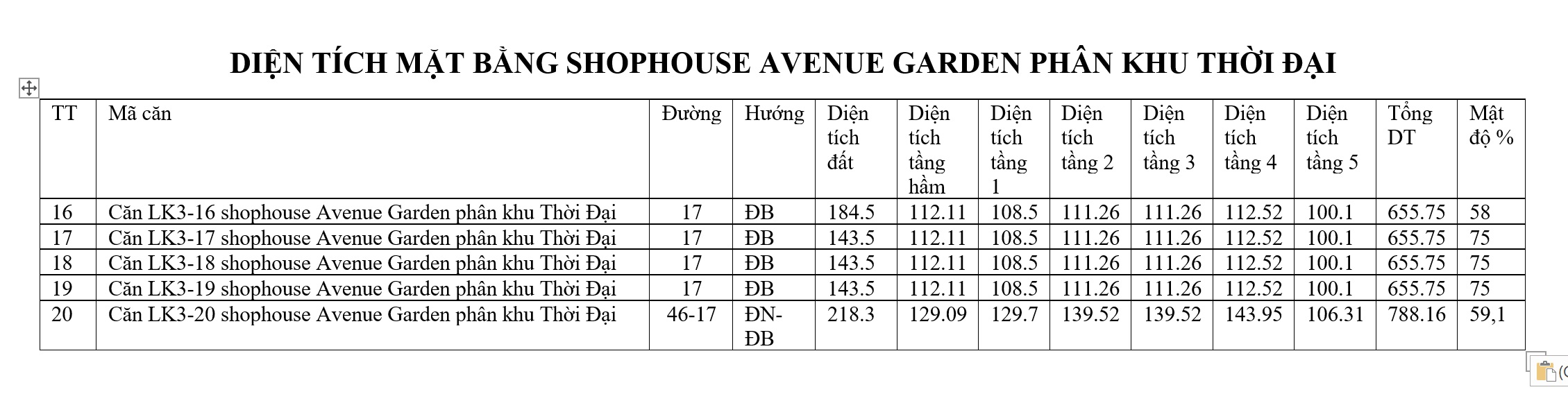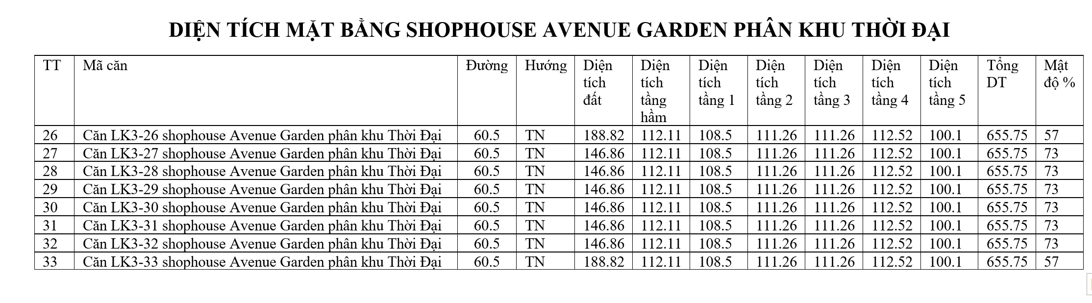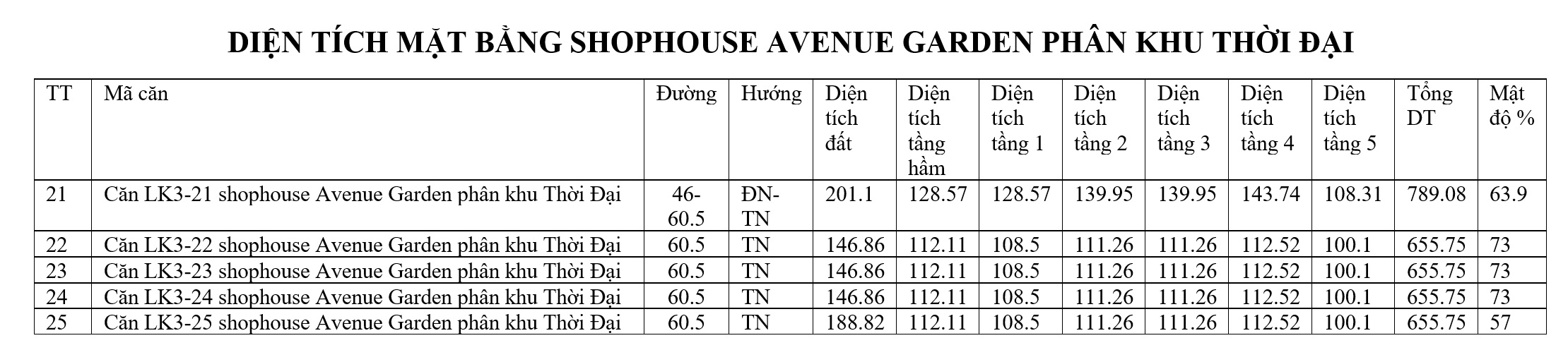 DIỆN TÍCH MẶT BẰNG SHOPHOUSE AVENUE GARDEN