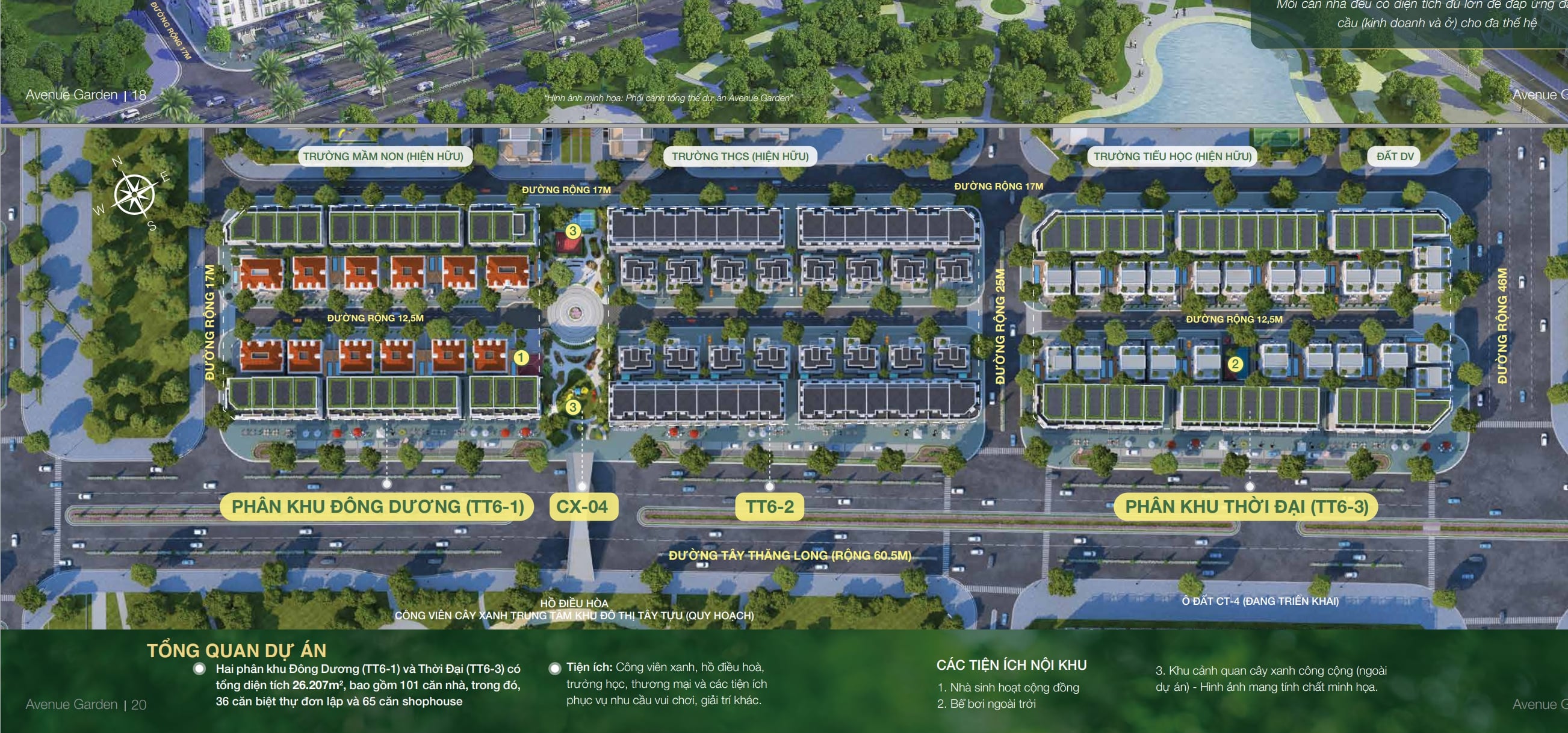 Dự án Avenue Garden gồm 02 phân khu: Phân khu Đông Dương TT6-1 có diện tích 10.923m2 và Phân khu Thời Đại TT6-3 có diện tích 15.284m2, tổng diện tích 26.207m2, gồm 101 căn, trong đó có 36 căn biệt thự đơn lập và 65 căn shophouse.