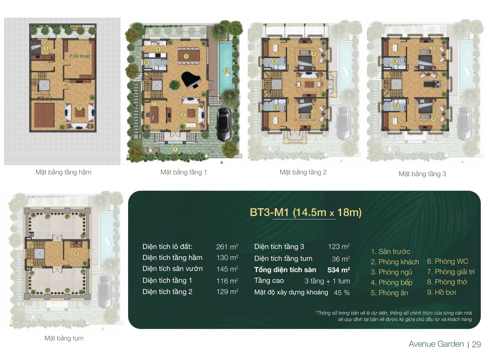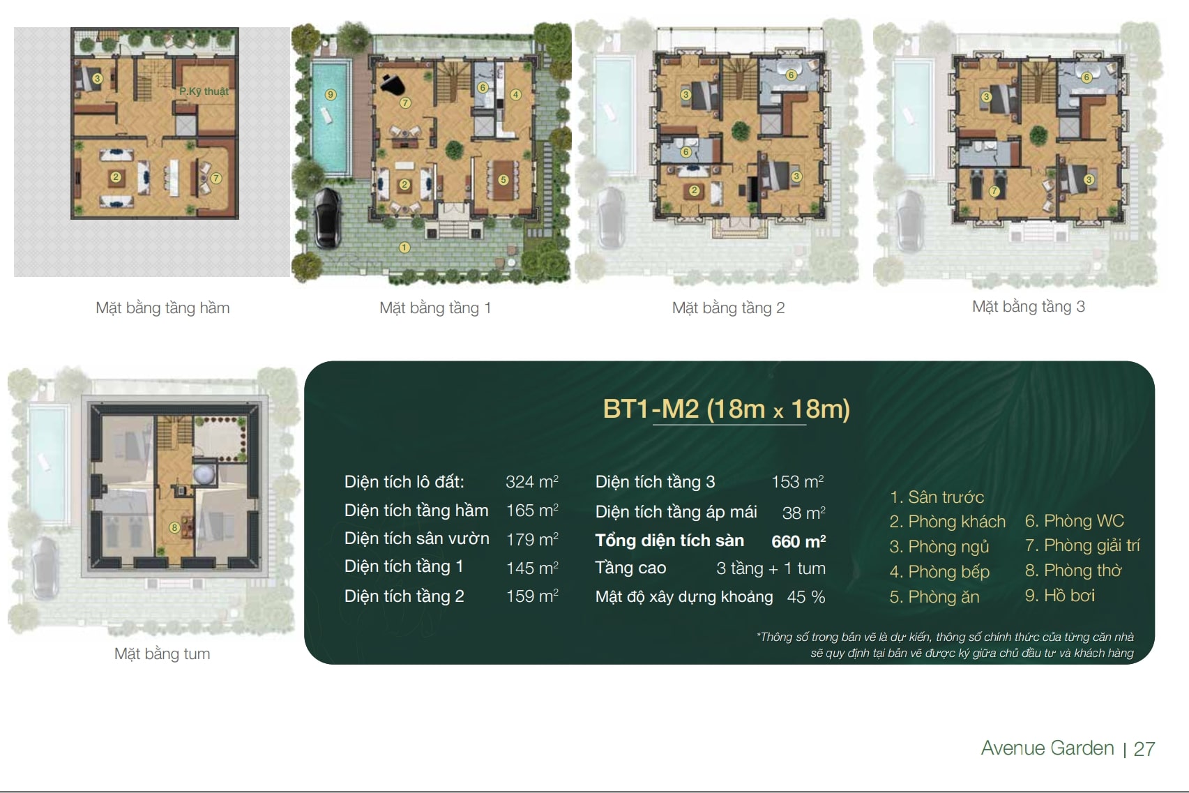+ Diện tích Biệt thự Avenue Garden: Gồm các loại diện tích 216m2, 220m2, 261m2, 320m2, 342m2, 410m2.