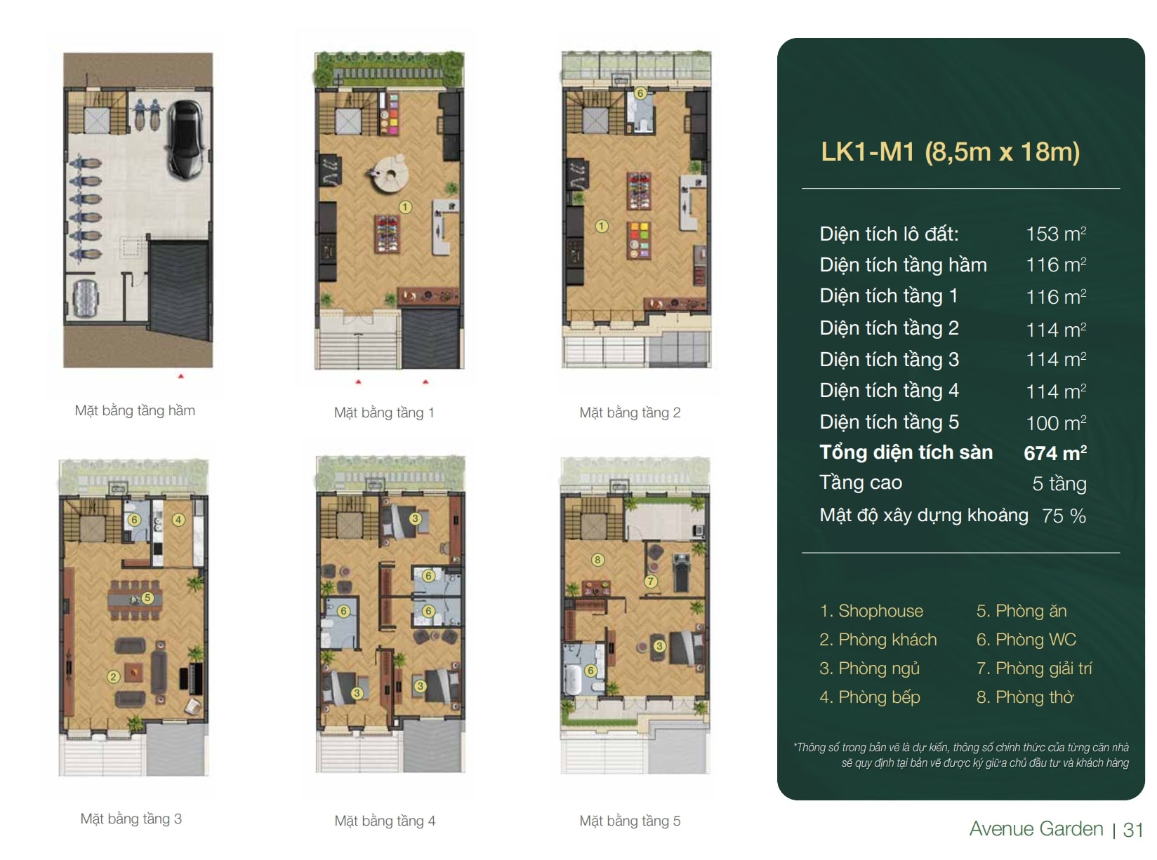 Shophouse Avenue Garden được thiết kế 5 tầng nổi và 1 tầng hầm (đây là ưu điểm nổi trội tại dự án, giúp tăng công năng sử dụng, giải quyết được nơi để xe riêng tư cho từng căn nhà).