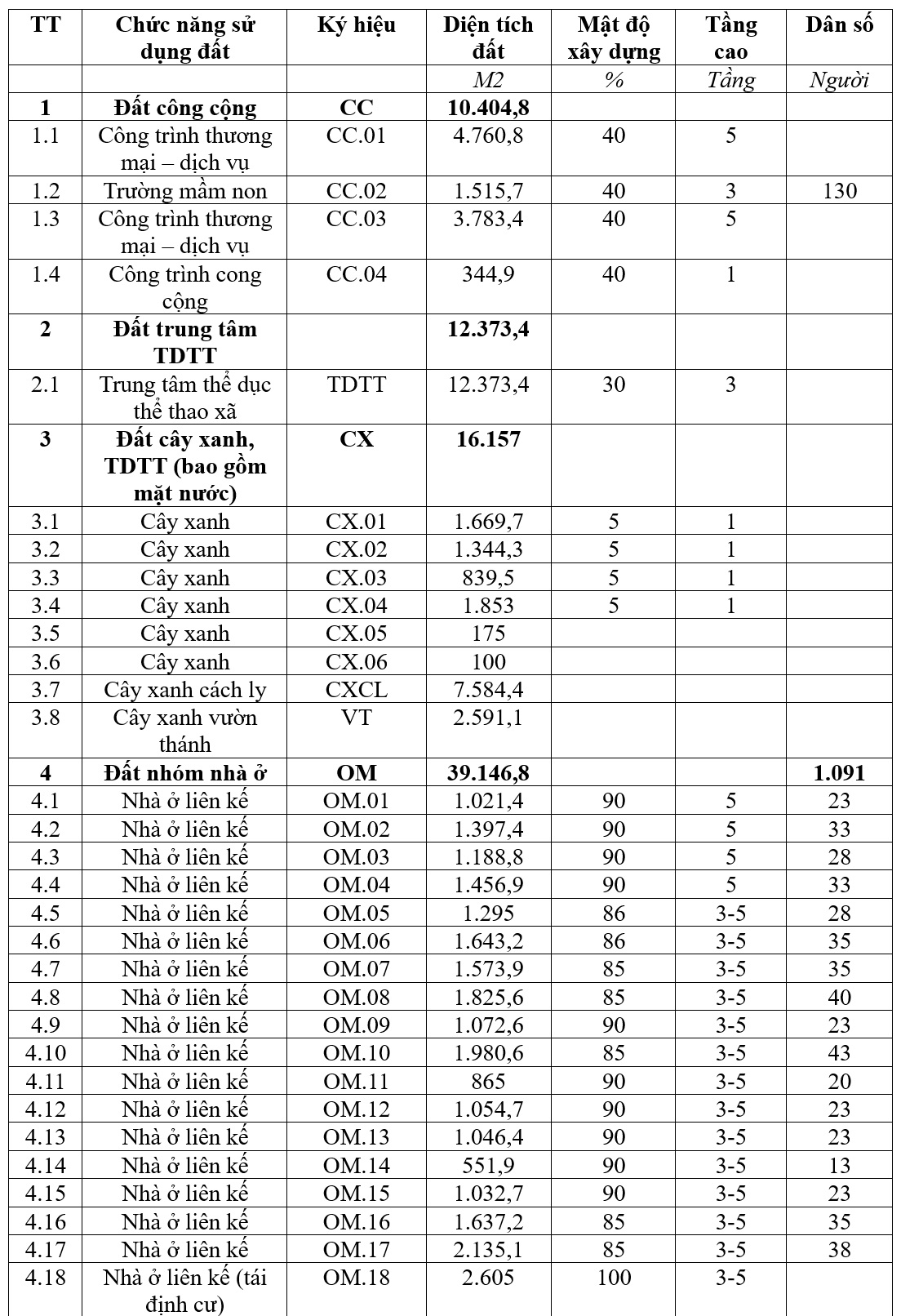 Đất cây xanh, TDTT (bao gồm mặt nước) |