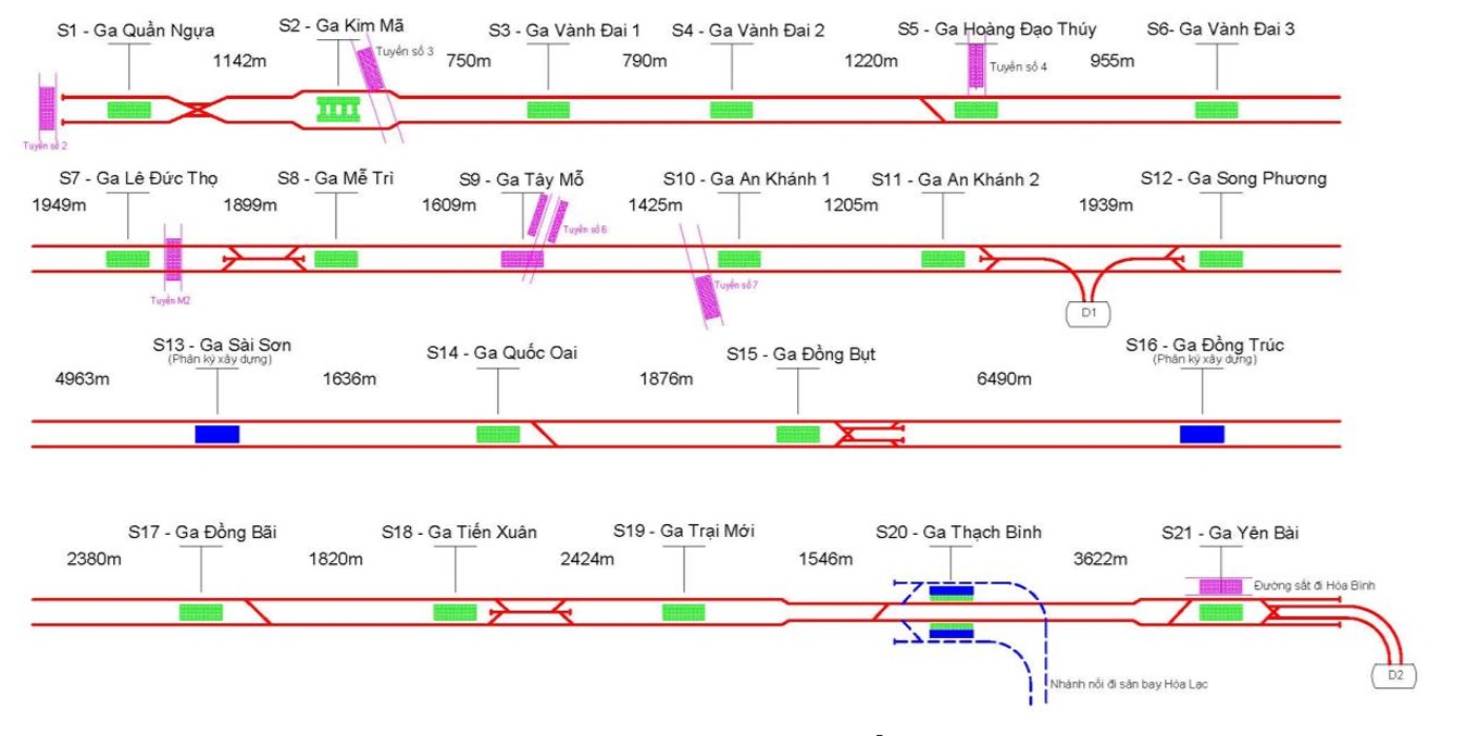 Số ga: 20 ga: gồm 06 ga ngầm, 03 ga trên cao, 11 ga mặt đất. Các ga chủ yếu bố trí dọc theo trục đại lộ Thăng Long và cao tốc Hòa Lạc – Hòa Bình.