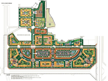 + Trung tâm khu đô thị mới bố trí các công trình công cộng thấp tầng của đơn vị ở, có mật độ xây dựng thấp kết hợp với cây xanh tạo nên cảnh quan thông thoáng xen giữa khu cao tầng và khu thấp tầng nhằm cải thiện điều kiện vi khí hậu cho khu vực.