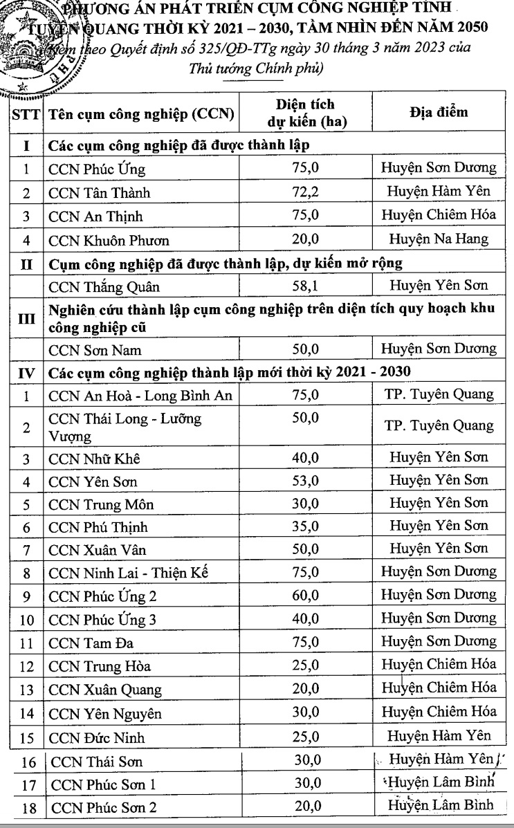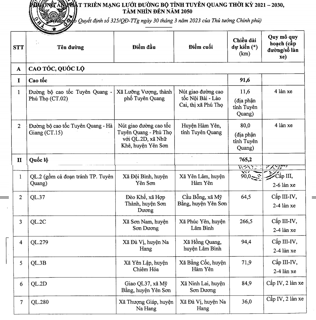 - Văn bản: 325/QĐ-TTg ngày 30/3/2023 về việc Phê duyệt Quy hoạch tỉnh Tuyên Quang thời kỳ 2021 – 2030, tầm nhìn đến năm 2050.