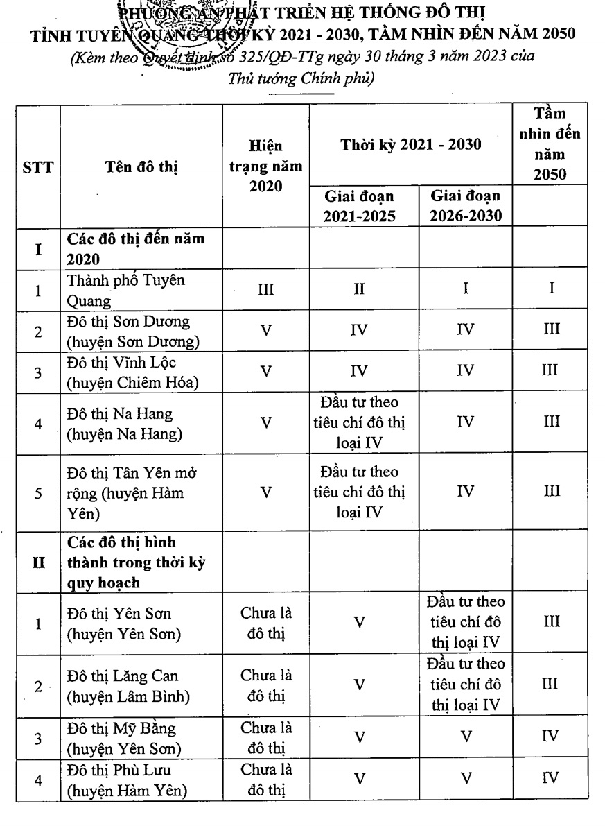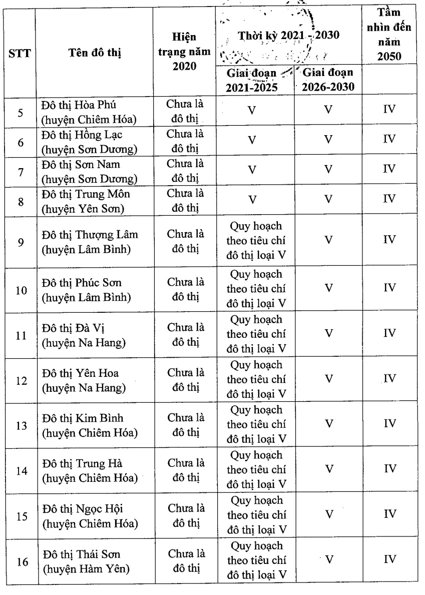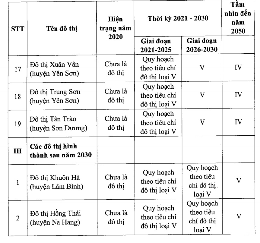 + Đầu tư xây dựng 04 đô thị: Sơn Dương (huyện Sơn Dương), Vĩnh Lộc (huyện Chiêm Hóa), Tân Yên (huyện Hàm Yên), Na Hang (huyện Na Hang), đạt tiêu chí đô thị loại IV; 19 đô thị còn lại đạt đô thị loại V.