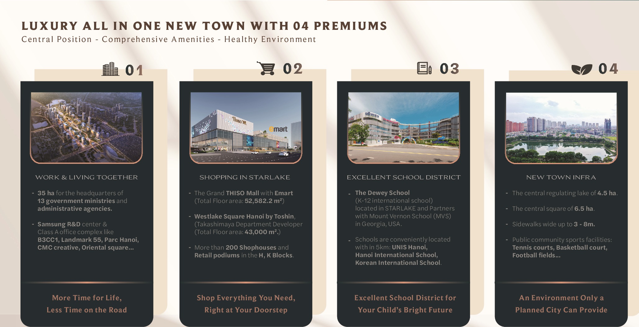 Khu đô thị Starlake là khu đô thị quốc tế, trong khu đô thị còn có nhiều giá trị đẳng cấp khác như hệ thống trung tâm thương mại Toshin – Takashimaya tại lô đất C1-CC1 đối diện dự án Embassy Garden, tổ hợp khách sạn Shilla Hotel tại lô đất B3-CC1 và B3-CC2 đối diện chung cư N01T6,7 Ngoại Giao Đoàn, tổ hợp văn phòng của tập đoàn CJ Group tại B2-CC1 và B2-CC2, tổ hợp văn phòng của Sam Sung R&D tại B1-CC3; tổ hợp Emart của Thaco Group tại ô B1-CC1, B1-CC2; tổ hợp khách sạn tháp đôi của SND tại H5-CC1, trường học Deway Shool tại các ô đất H3 – NT1, TH1, TH2,… công viên và hồ điều hòa tại ô đất H8, trong giai đoạn tới còn có các tổ hợp quảng trường và hồ nước tại D3, trường học tại C1 – TH1,2, K6-NT1, TH1,2, các tổ hợp văn phòng,….phục vụ cho 24.500 cư dân toàn khu đô thị và các khách vảng lai tới xử lý công việc.