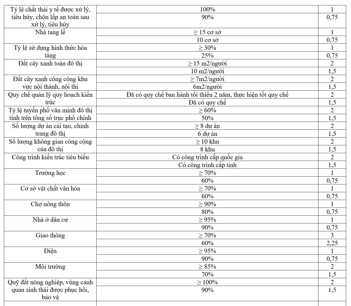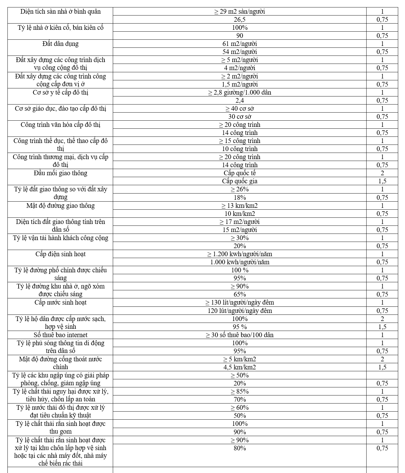 Mật độ dân số toàn đô thị đạt 3.000 người/km2 trở lên, khu vực nội thành tính trên diện tích đất xây dựng đô thị đạt từ 12.000 người/km2 trở lên.