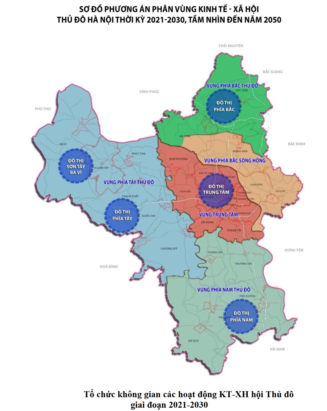 5. Vùng phía Bắc Thủ đô: khu vực này có điều kiện phát triển kinh tế công nghiệp, dịch vụ, nông nghiệp hiệu quả cao gắn với cảng hàng không quốc tế Nội Bài và các tuyến hành lang kinh tế, các tuyến đường cao tốc và kết nối của Thủ đô. Goài ra, đây là khu vực có vị trí quan trọng về quốc phòng của thủ đô. Khu vực này đề xuất gồm các huyện Sóc Sơn, một phần của huyện Mê Linh và huyện Đông Anh.