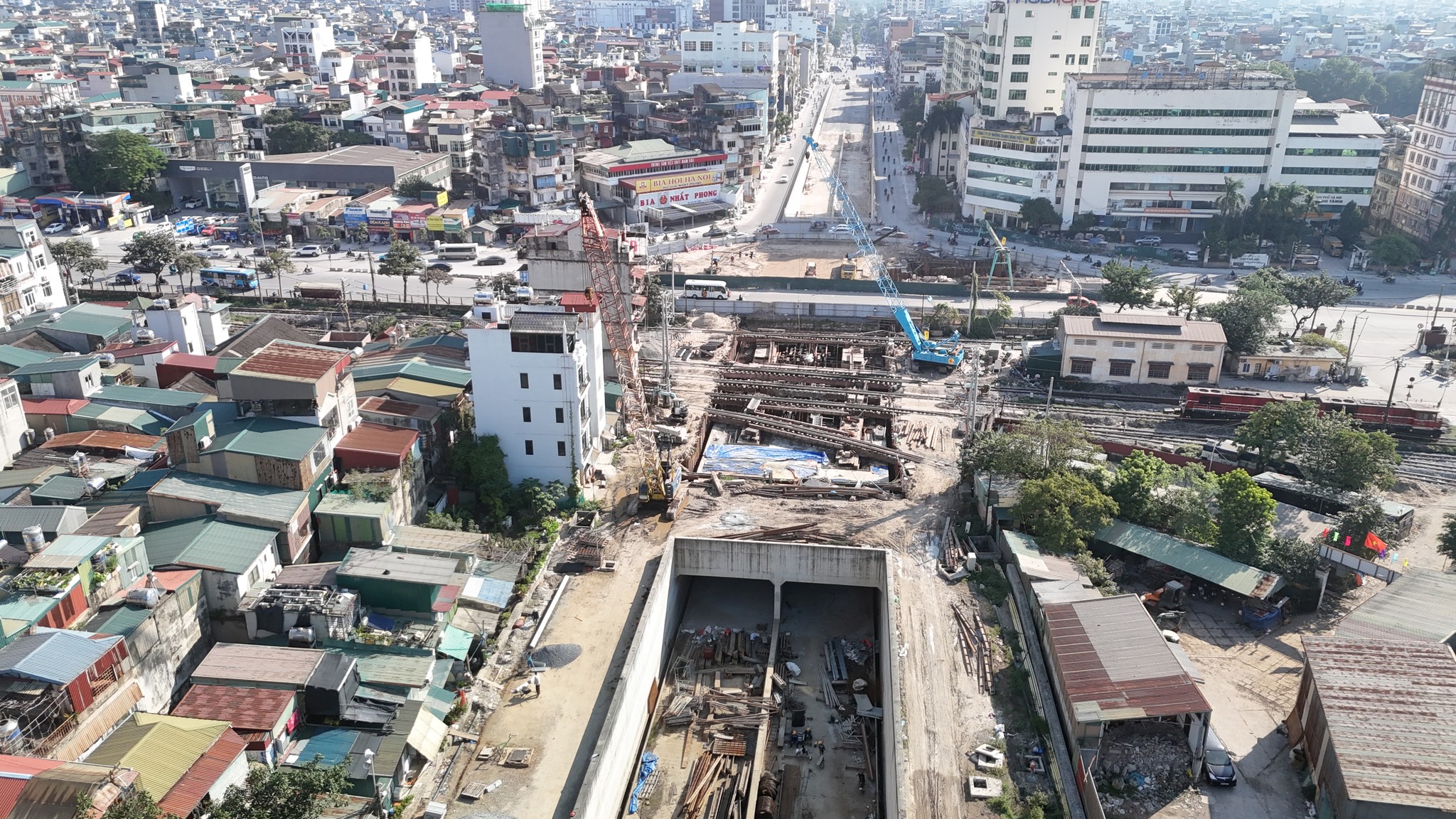- Phần hầm kín đang thi công đốt hầm phía dưới ga hàng hóa Giáp Bát, đoạn này dưới thì đào hầm trên tàu vẫn chạy, suốt thời gian qua ngày chỉ thi công được 2 tiếng, rất chậm.