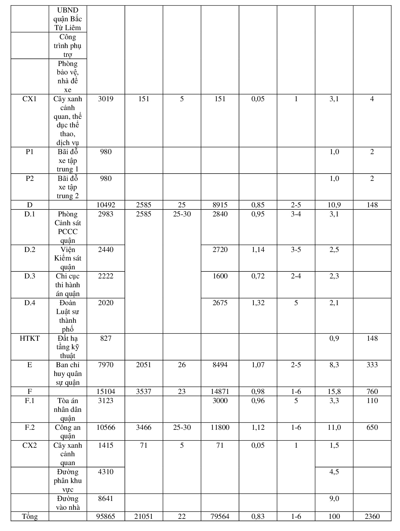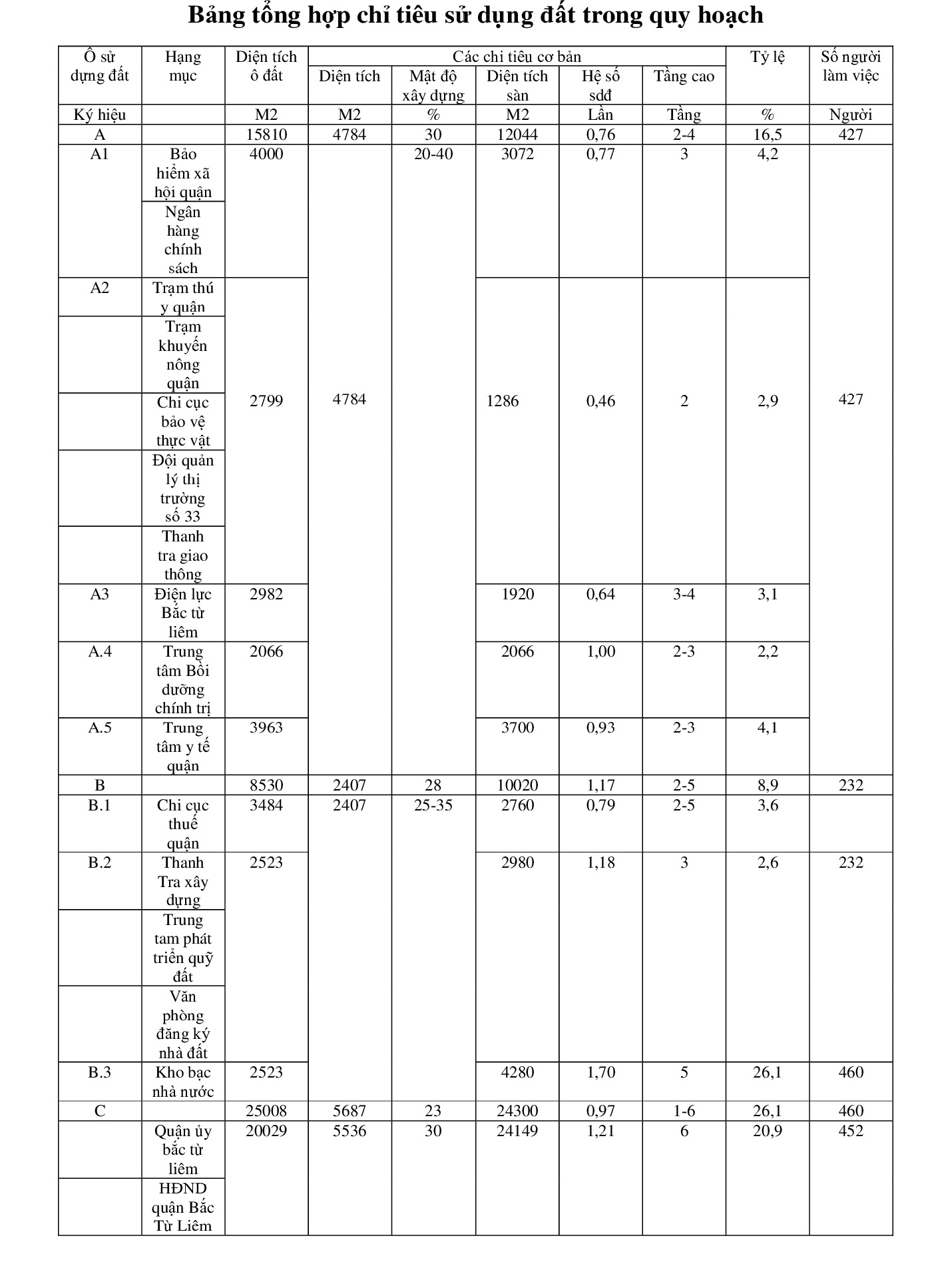 Khu đất nghiên cứu quy hoạch chi tiết Trung tâm hành chính quận Bắc Từ Liêm có diện tích khoảng 95.865m2. được quy hoạch thành 6 ô sử dụng đất: ký hiệu là A, B, C, D, E, F có tổng dịch khoảng 82.914m2 và đường giao thông phân khu vực và đường vào nhà có mặt cắt ngang B≥12m, diện tích khoảng 12.951m2, cụ thể như sau.