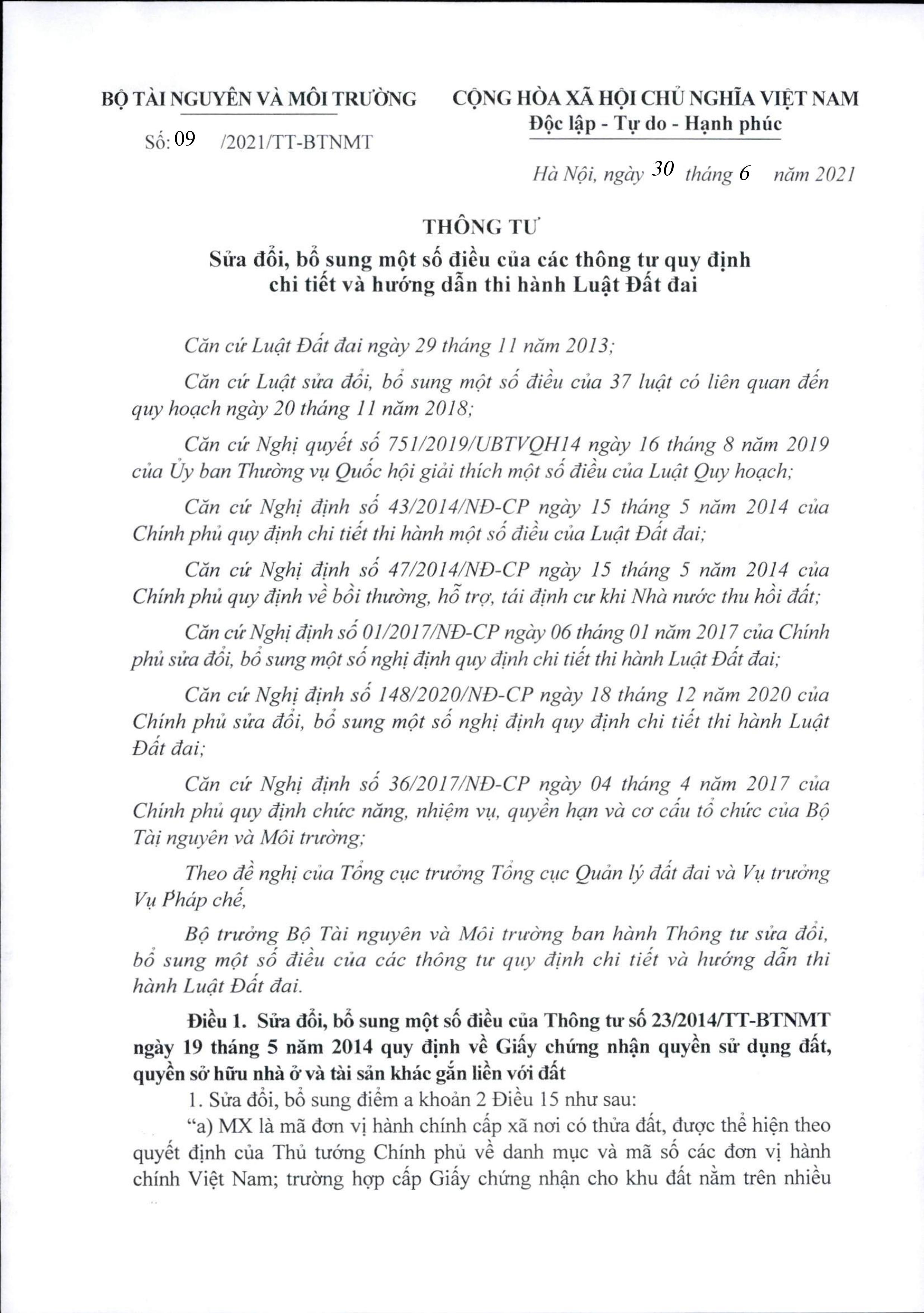Bộ Tài nguyên và Môi trường đã có Thông tư số 09/2021/TT-BTNMT sửa đổi, bổ sung 9 Thông tư hướng dẫn thi hành Luật Đất đai 2013. Trong đó, có nhiều điểm mới liên quan đến giấy chứng nhận(GCN) quyền sử dụng đất (QSDĐ), quyền sở hữu nhà ở và tài sản khác gắn liền với đất (sổ đỏ) áp dụng từ ngày 1/9/2021