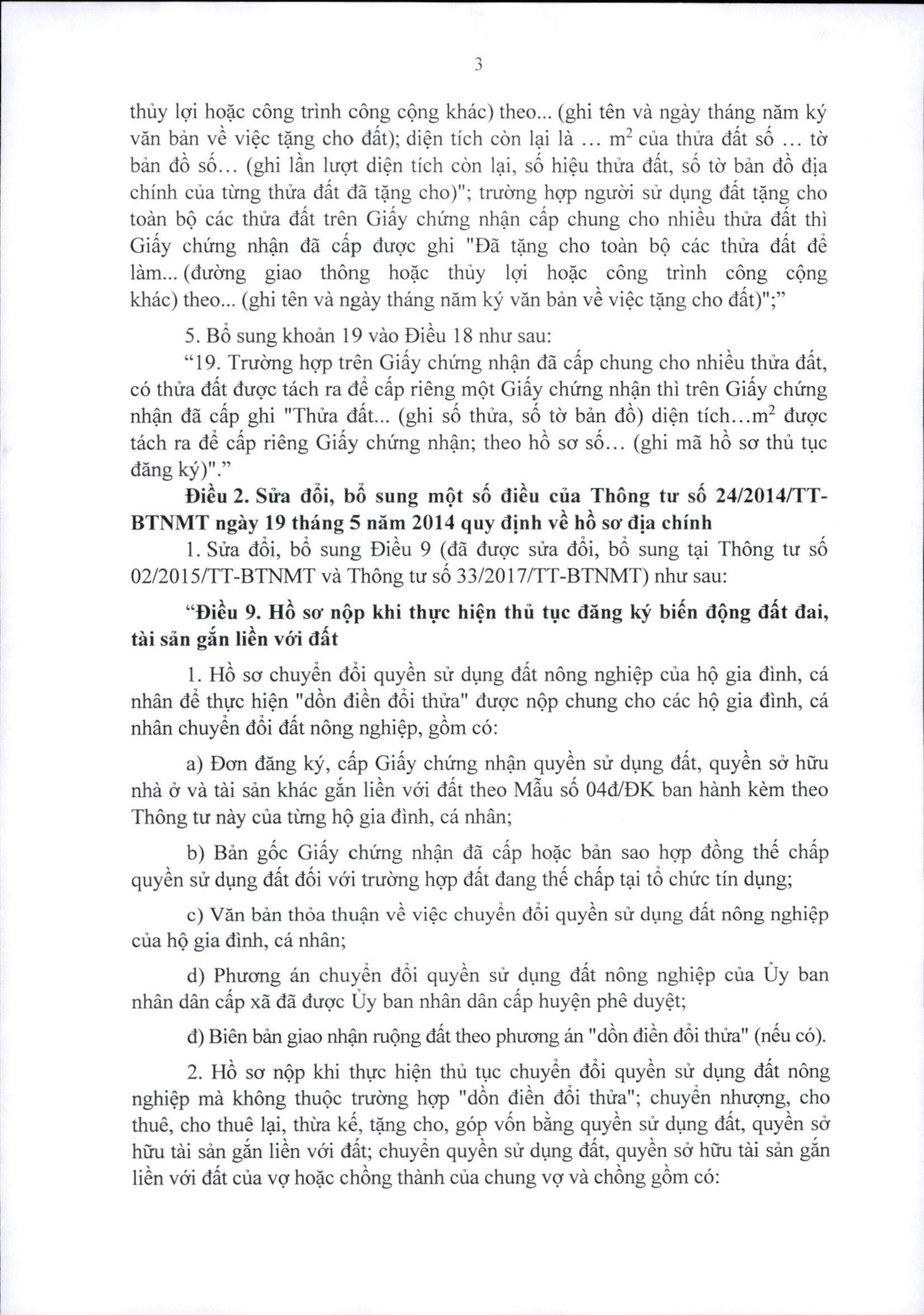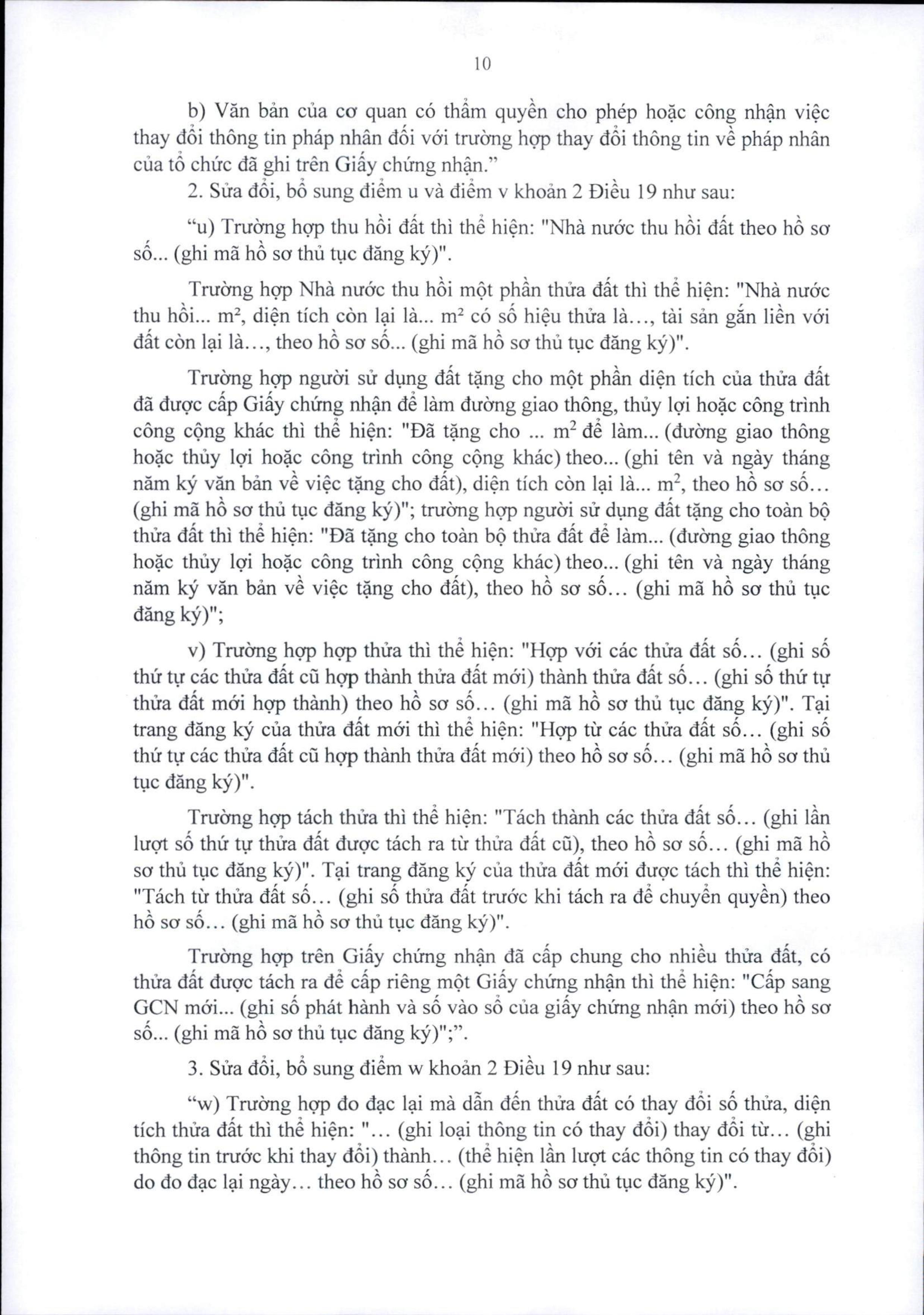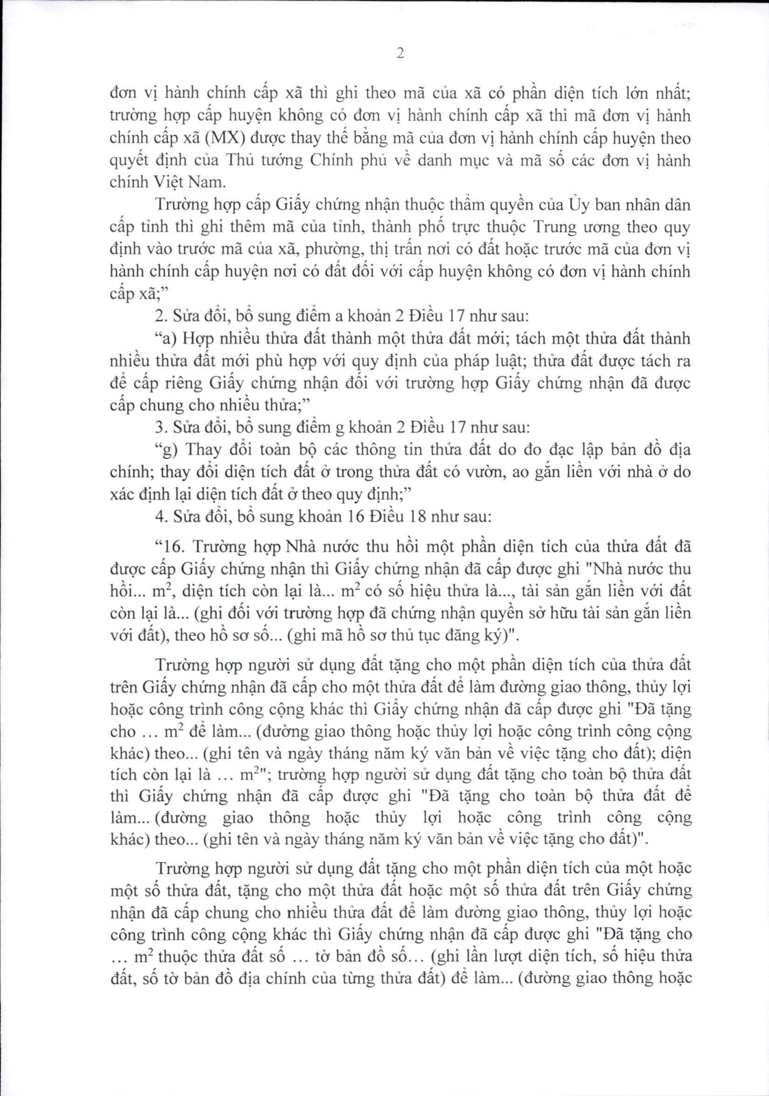 Trường hợp người sử dụng đất tặng cho một phần diện tích của một hoặc một số thửa đất, tặng cho một thửa đất hoặc một số thửa đất trên Giấy chứng nhận đã cấp chung cho nhiều thửa đất để làm đường giao thông, thủy lợi hoặc công trình công cộng khác thì Giấy chứng nhận đã cấp được ghi "Đã tặng cho … m2 thuộc thửa đất số ... tờ bản đồ số... (ghi lần lượt diện tích, số hiệu thửa đất, số tờ bản đồ địa chính của từng thửa đất) để làm... (đường giao thông hoặc thủy lợi hoặc công trình công cộng khác) theo... (ghi tên và ngày tháng năm ký văn bản về việc tặng cho đất), diện tích còn lại là ... m2 của thửa đất số ... tờ bản đồ số,.. (ghi lần lượt diện tích còn lại, số hiệu thửa đất, số tờ bản đồ địa chính của từng thửa đất đã tặng cho)";